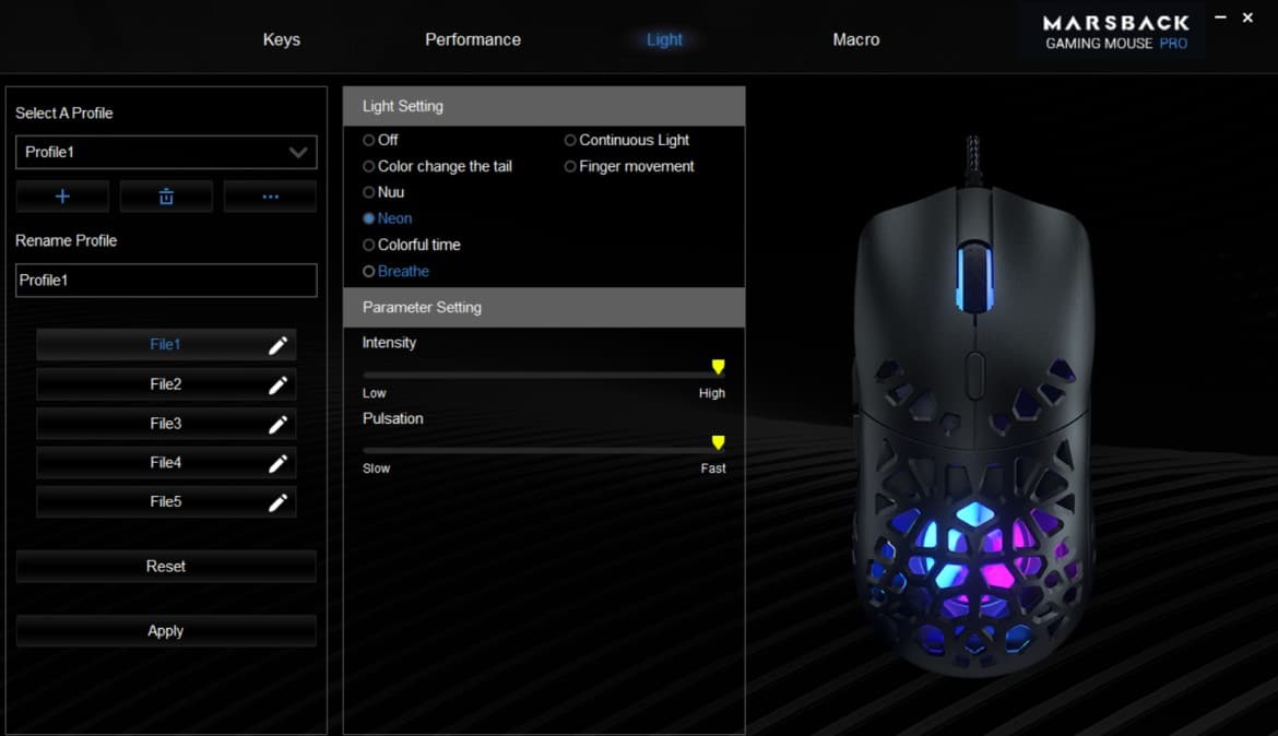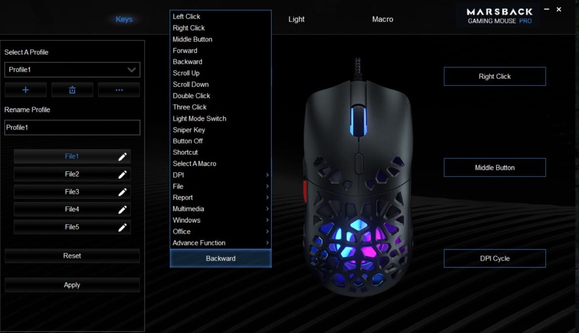Marsback verbaut den High-End-Sensor Pixart PMW 3389, der mit satten 16.000 DPI auflöst und wirklich ausgesprochen präzise arbeitet. Erfreulicherweise kann auch ohne Software die volle Leistung abgerufen werden: 7 Stufen sind beim DPI-Schalter voreingestellt (400, 800, 1.200, 1.600, 2.400, 3.200 und 16.000 DPI – sehr löblich! Softwareseitig sind sogar Anpassungen von jeweils 50 DPI möglich.