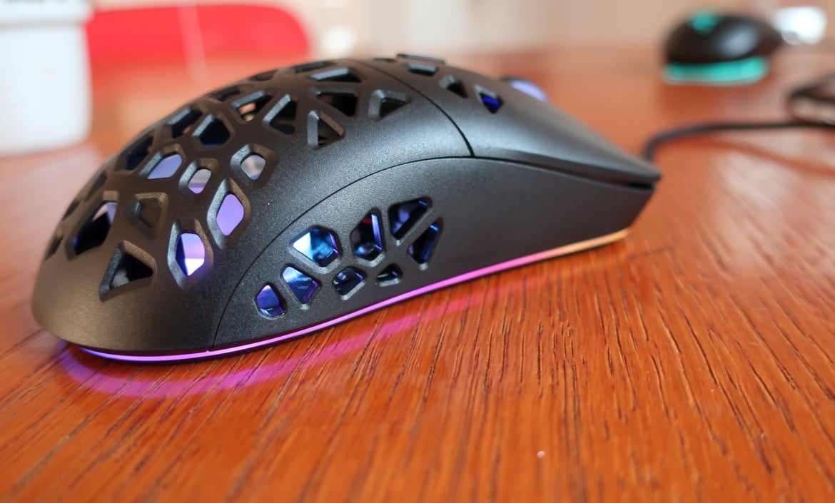 Das auffällige Wabenmuster samt Prismen-Anordnung zieht sich über den Mausrücken, sowie die Seiten der Zephyr Pro RGB und fällt dabei etwas großmaschiger aus als beispielsweise bei der von uns zuletzt getesteten Sharkoon Light² 180. Trotzdem gefällt uns die Verarbeitung der mit rund 69 Gramm sehr leichten Marsback etwas besser. Selbst unter Druck gibt die offene Oberseite nicht nach und fühlt sich wirklich hochwertig an. Die RGB-Beleuchtung taucht zudem alle Seiten der Maus in Farbe. Vom Scrollrad über den Lüfter bis hin zu einem Streifen, der die Unterseite vollständig einrahmt.