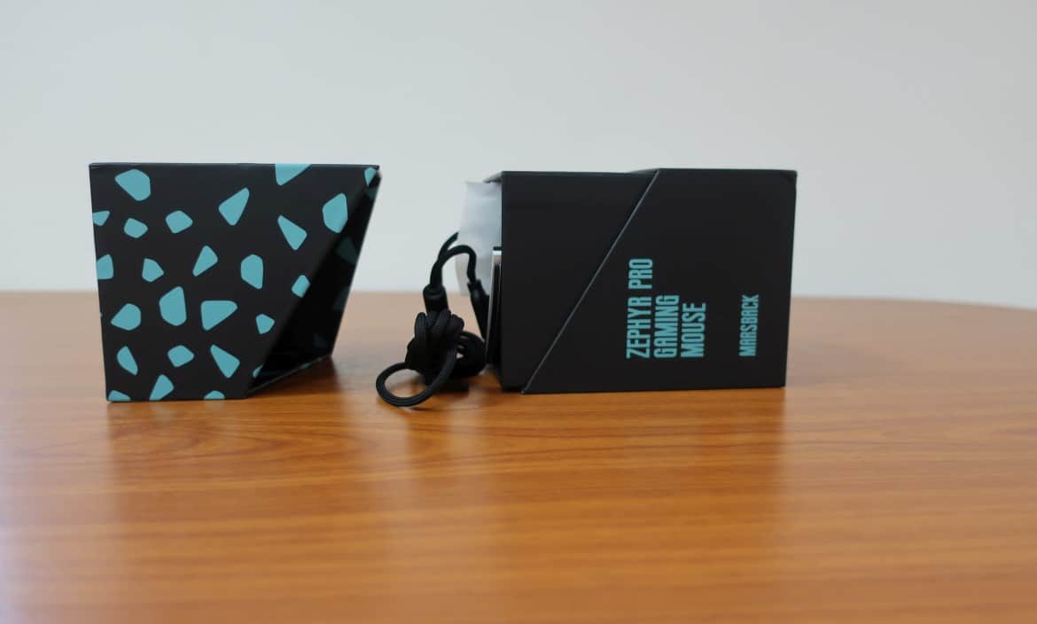 Die Marsback Zephyr Pro RGB ist anders. Das wird bereits bei der Verpackung der Gaming-Maus offensichtlich, die nicht in einem typischen Karton daherkommt. Stattdessen nehmen Nager samt Anleitung und Aufklebern in einem unorthodoxen, schwarzen Karton samt türkiser Details Platz. Einen 10-prozentigen Rabattcode für den eigenen Onlineshop gibt es obendrauf.