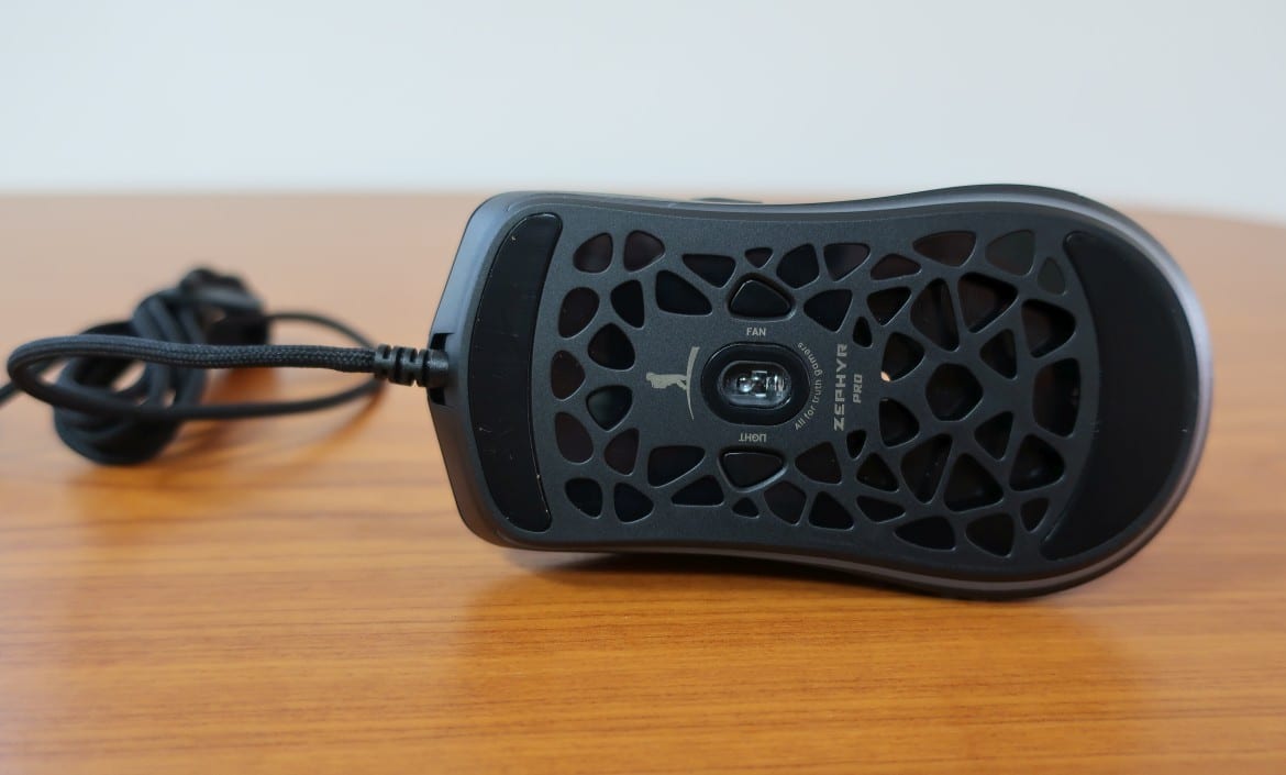 Insgesamt verfügt die Zephyr Pro über sechs Tasten, die sich aus den beiden primären Schaltern (mechanische Omron-Switches), klickbarem Mausrad, DPI-Taste und den beiden Zusatztasten zusammensetzen. Hinzu gesellen sich zwei weitere Tasten auf der Unterseite, mit denen die RGB-Beleuchtung sowie die Lüfterdrehzahl angepasst werden kann. Zwei großflächige und gut verarbeitete PTFE-Mausfüße runden den Unterbau gekonnt ab.