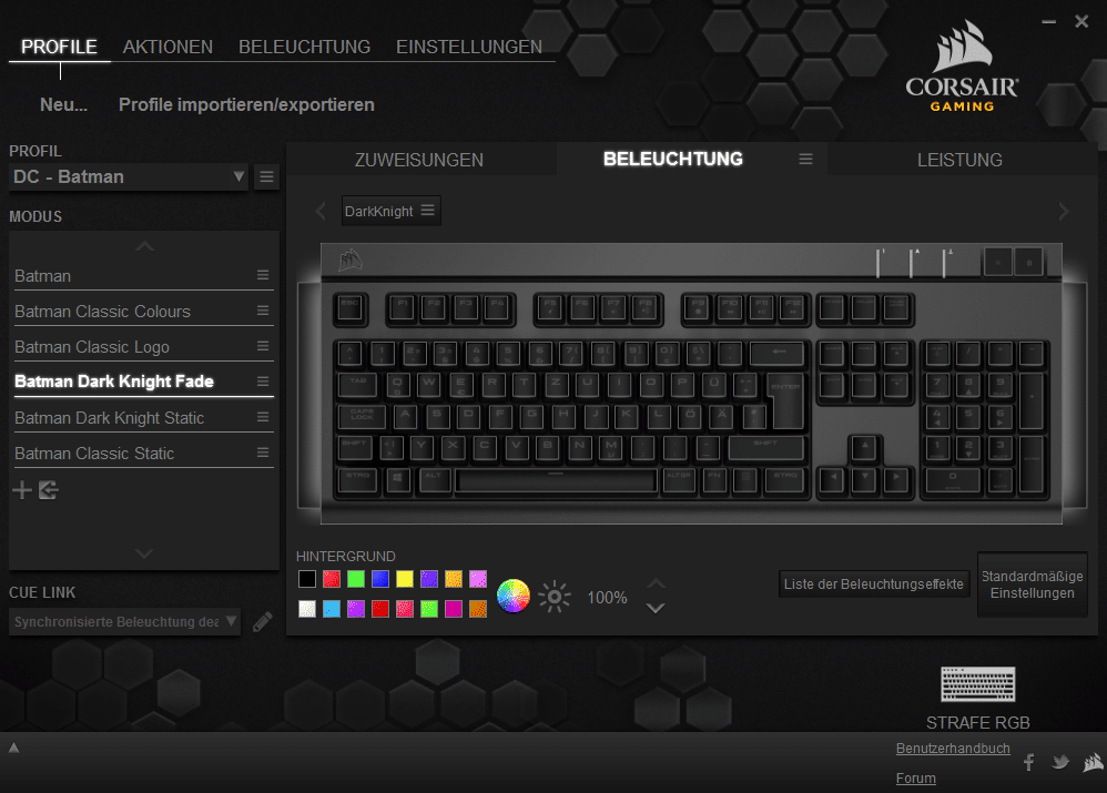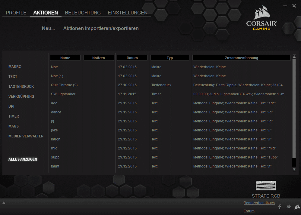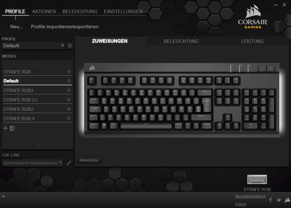 Mit der Corsair Utility Engine lassen sich nicht nur Tastenzuweisungen, sondern, für die RGB-Enthusiasten unter euch, sowohl Makros als auch Beleuchtungen und Effekte erstellen. Dabei bekommt ihr sowohl eine ganze Reihe an Effekten mitgeliefert, als auch die Möglichkeit selbst welche zu erstellen. Wer faul ist aber trotzdem gerne ein schön anzusehendes animiertes Beleuchtungsprofil will, wird im Corsair Forum fündig. Dort werden Fan Made Profile für die Tastatur hochgeladen, welche einfach in eure Software importiert werden können.