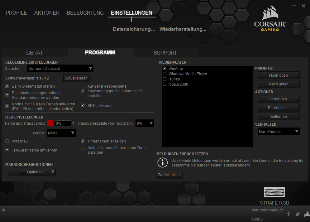 Auch in Sachen Software bringt Corsair eine überdurchschnittlich gute Leistung und sticht die Konkurrenz größtenteils aus. Die Corsair Utility Engine könnt ihr euch bei Corsair in jeder denkbaren Sprache herunterladen und leicht installieren. Danach startet diese automatisch beim Hochfahren des PCs.
