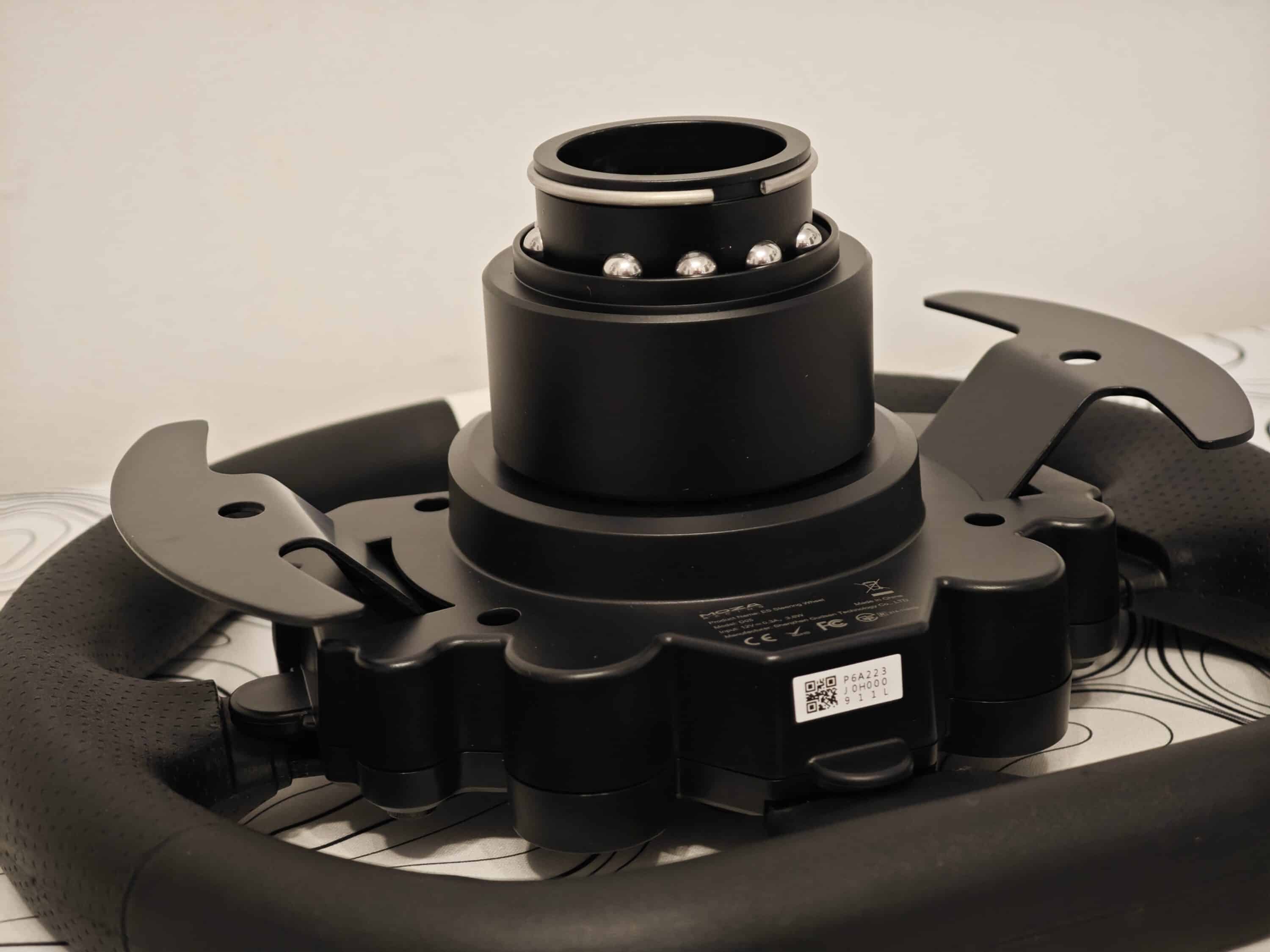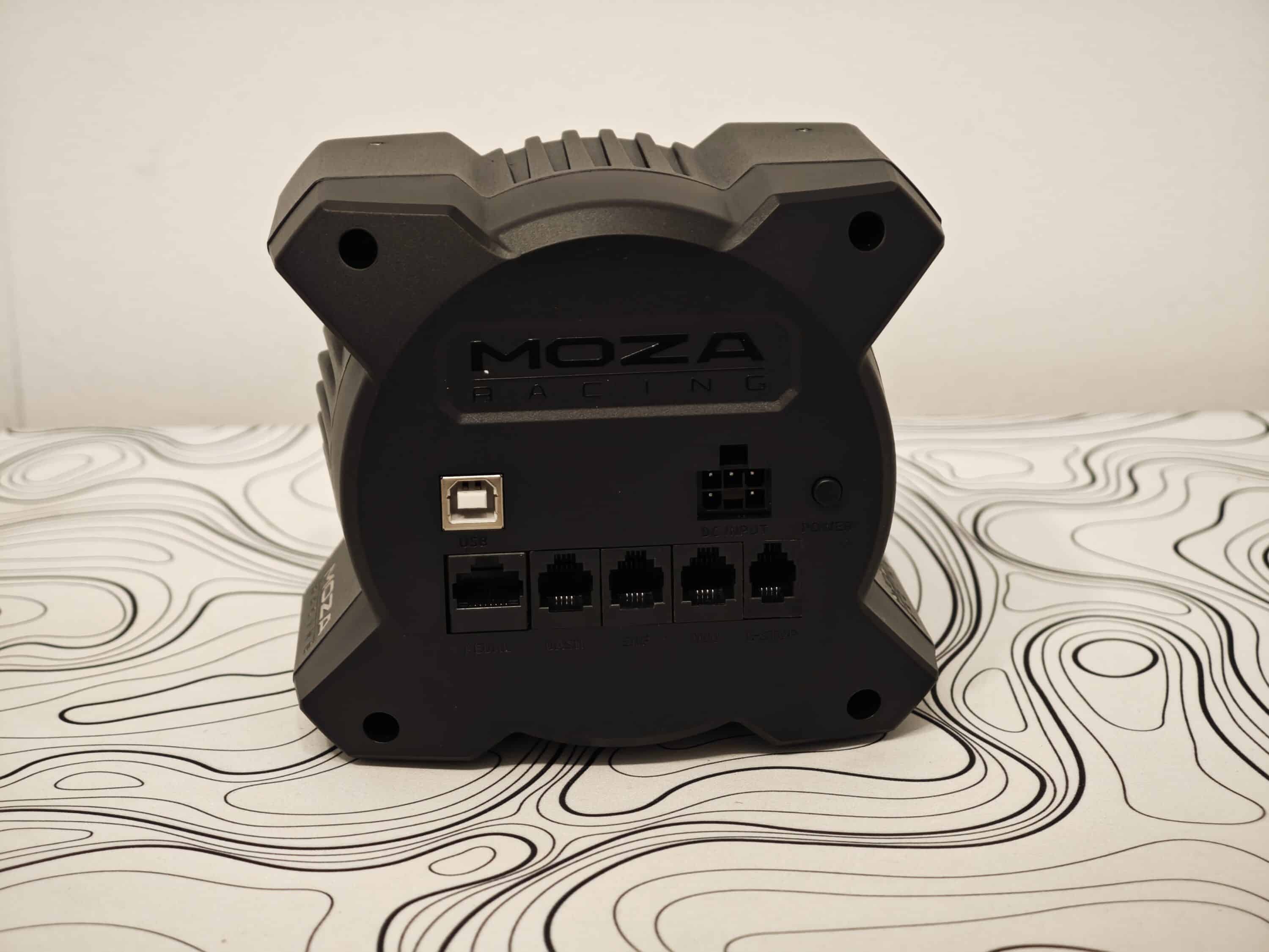 Die Verarbeitung des MOZA R3 Bundle ist exzellent und auch optisch macht das Lenkrad-Bundle eine Menge her. Die Wheel Base besteht dabei aus Aluminium in Luftfahrtqualität und fühlt sich enorm hochwertig an. An der Rückseite finden wir die verschiedenen beschrifteten Anschlüsse.
