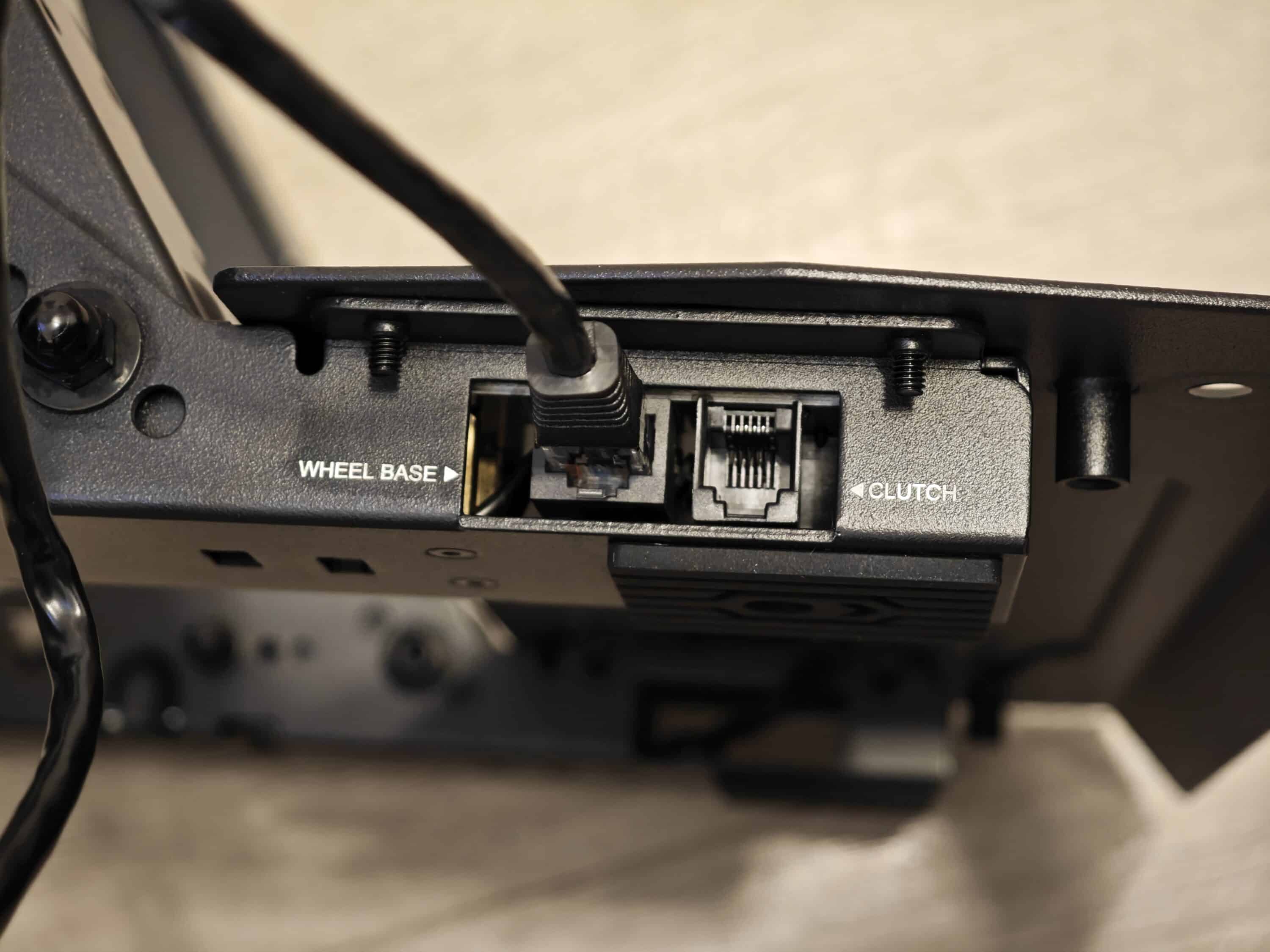 Neben dem USB-Port zum Verbinden mit PC/Konsole findet ihr dort den Anschluss für das Stromkabel, sowie den Power-Button. Darunter lässt sich jede Menge Zubehör nutzen. Neben Pedalen kann das R3 über RJ45-Stecker unter anderem mit einer Handschaltung, Handbremse, einem Display (Digital Dash) und mehr kombiniert werden.