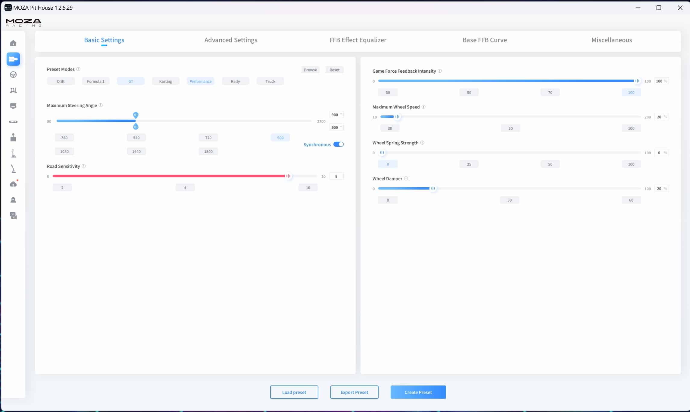 So lassen sich beispielsweise der maximale Lenkwinkel zwischen 90 Grad und 900 Grad einstellen, das Force Feedback der Base justieren und in den Detaileinstellungen viele weitere Parameter verändern.