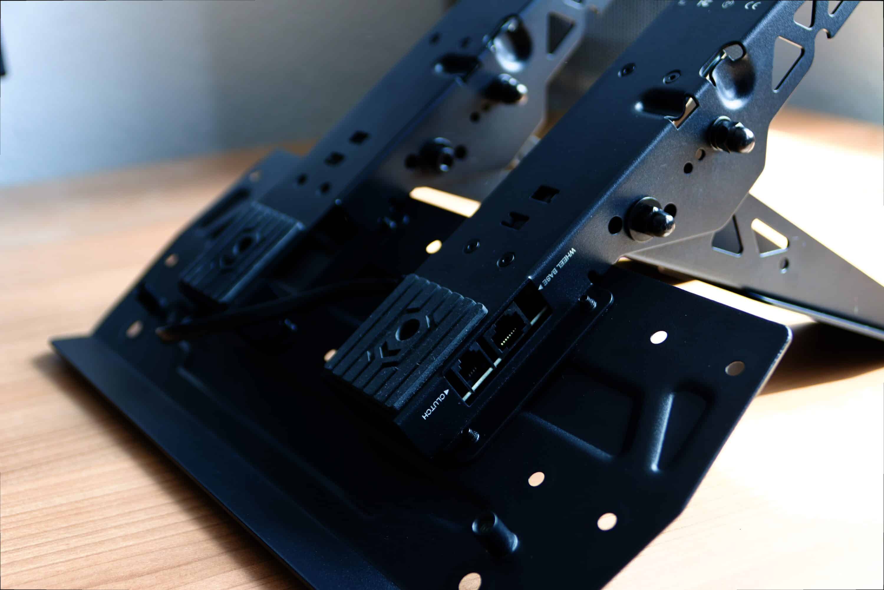 Die Verkabelung ist dank der eindeutigen Steckertypen selbsterklärend: Alle Kabel passen nur in den jeweils vorgesehenen Anschluss und sind an der Rückseite der Base klar beschriftet, sodass Fehler praktisch ausgeschlossen sind. Auch das Anschließen der Pedale und optionaler Add-ons geht schnell: Die Pedaleinheit wird per RJ45-Stecker verbunden, zudem gibt es zusätzliche Bohrungen, um den Pedalabstand individuell zu variieren.