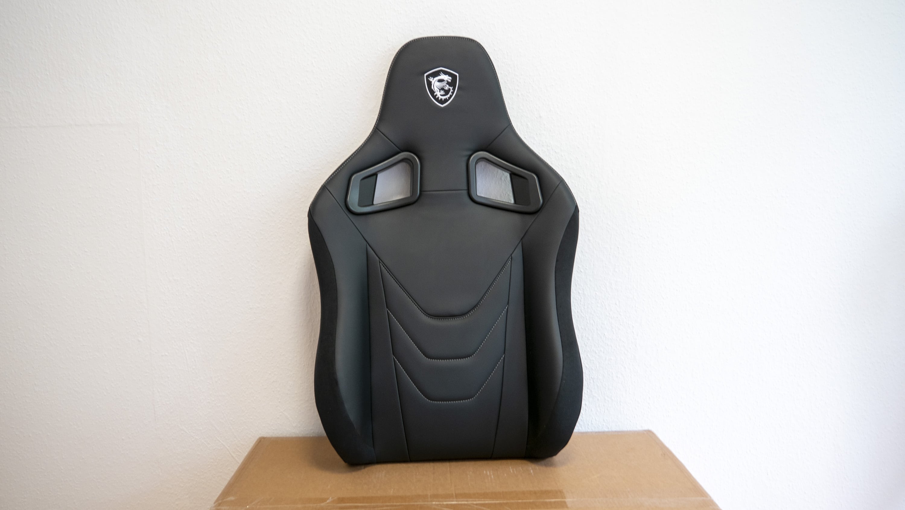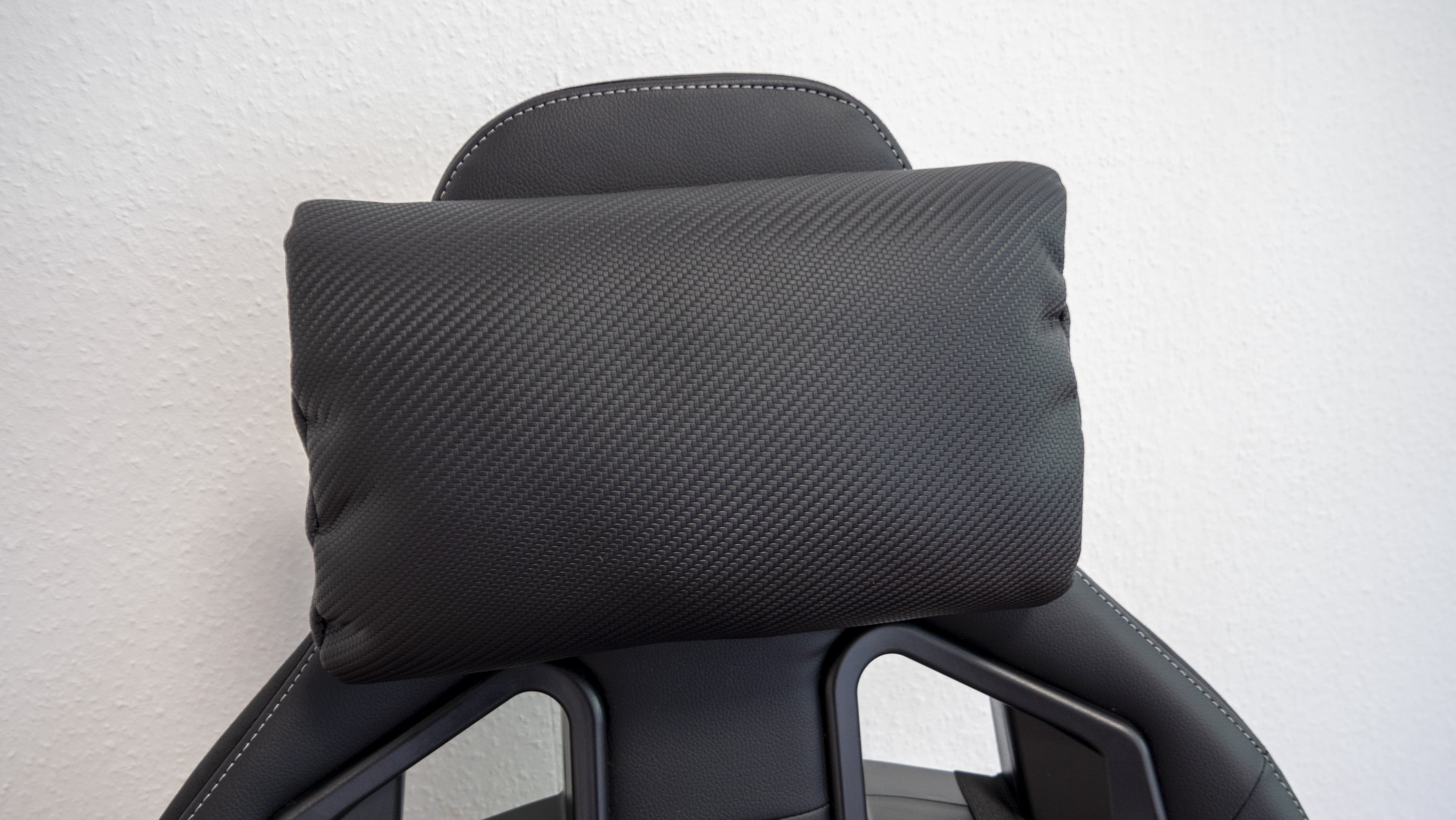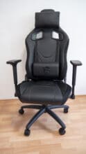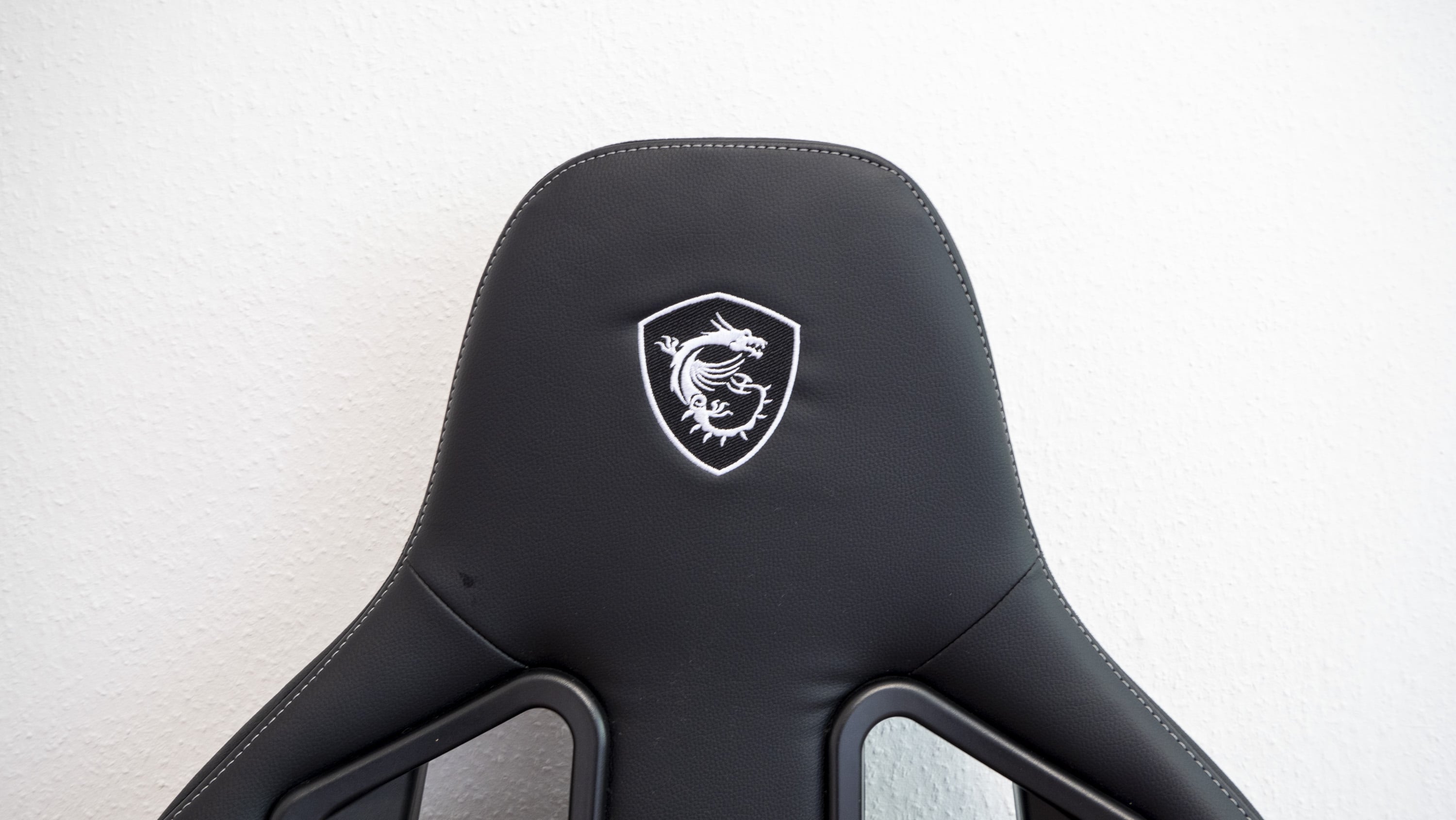 Optisch unterscheidet der aufgebaute Gaming-Stuhl sich kaum vom auf dem Markt erhältlichen Standard: Er ist in dunkler Sportsitzoptik gehalten. Auffällig sind lediglich die in den Sitz sowie die Sitzkissen eingearbeiteten Details, etwa das sich in Weiß vom schwarzen Untergrund absetzende Logo, die ebenfalls weißen Nähte oder das ins Lendenwirbelsäulenkissen eingearbeitete Logo. Auf der Oberseite ist darüber hinaus ein samtartiges Material verwendet worden, das dem Stuhl ein hochwertiges Aussehen verleihen soll. Ansonsten ist der Stuhl mit Kunstleder bezogen. Insgesamt sind die Materialien gut verarbeitet. Aufgefallen ist uns jedoch, dass Rückenlehne und Sitzfläche sehr eng beieinander liegen (andere Gaming-Stühle haben da oftmals einen Spalt), sodass die beiden Flächen aneinander reiben und man dies leider auch hört, wenn man sich auf dem Stuhl bewegt. Das sollte sich jedoch nach einer Weile legen, und ansonsten kann man die Stelle auch einfach mal einfetten.