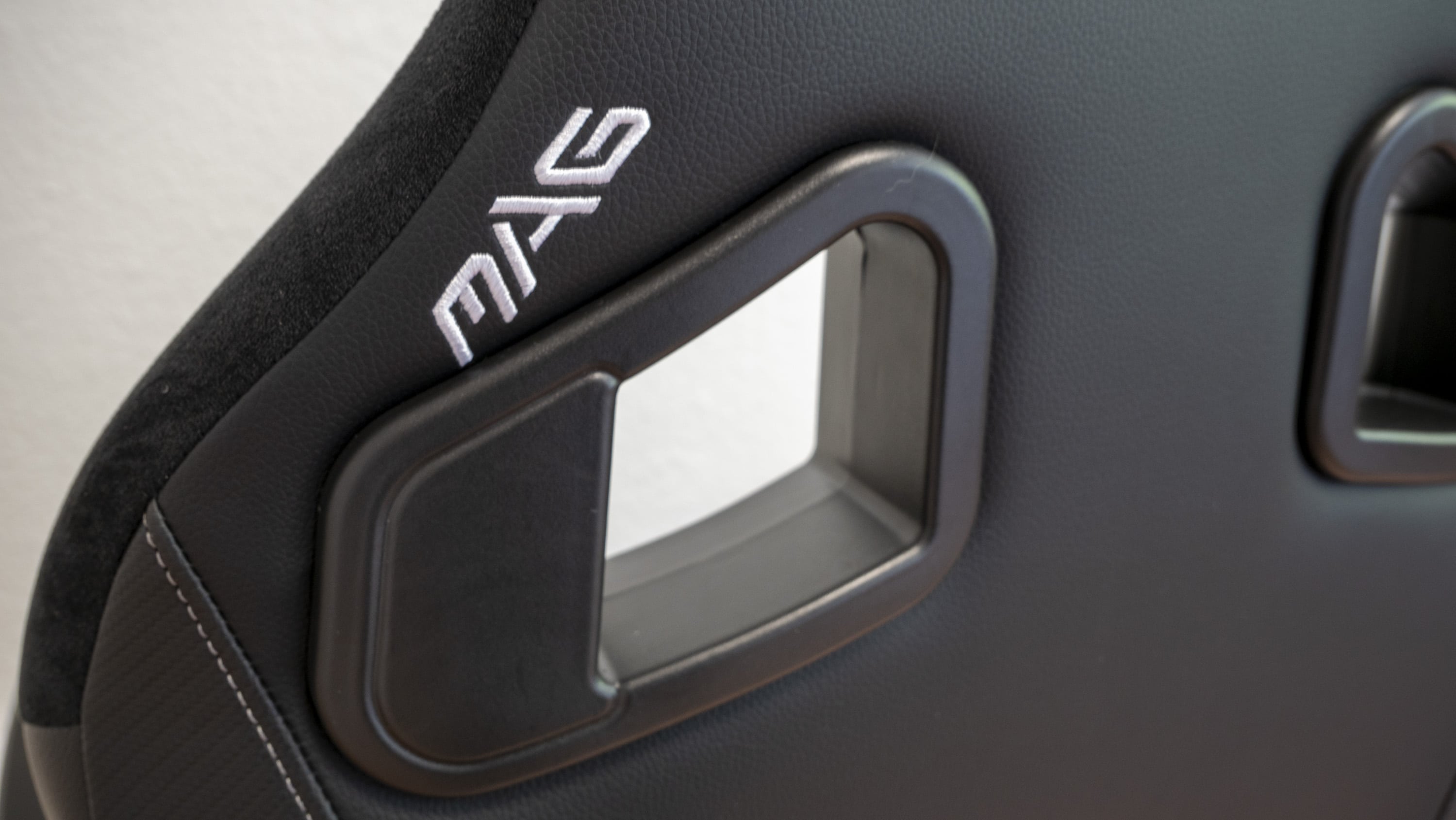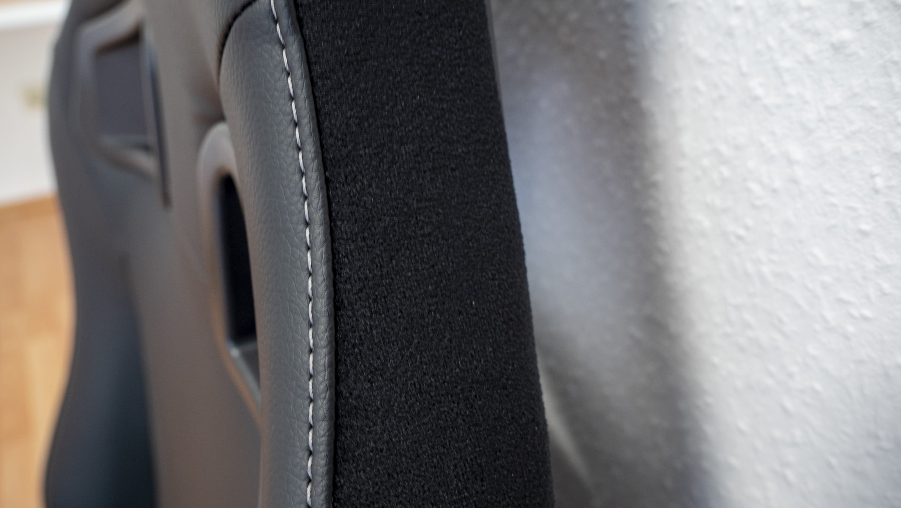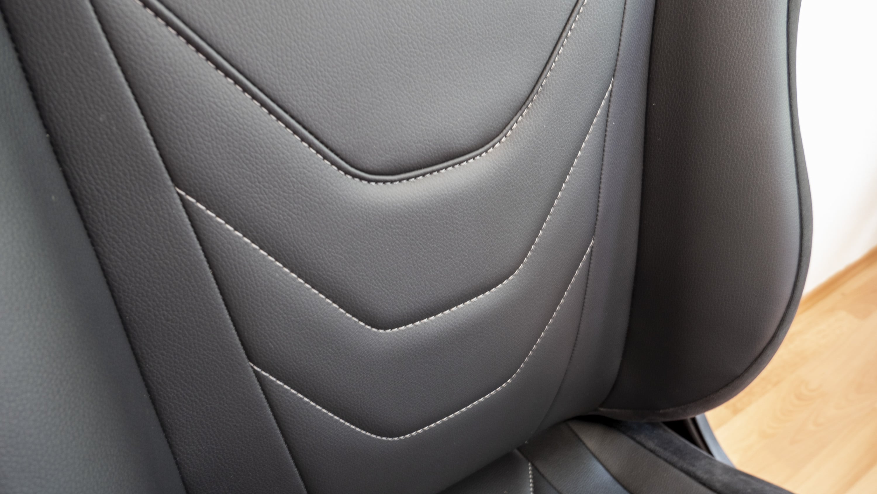 Optisch unterscheidet der aufgebaute Gaming-Stuhl sich kaum vom auf dem Markt erhältlichen Standard: Er ist in dunkler Sportsitzoptik gehalten. Auffällig sind lediglich die in den Sitz sowie die Sitzkissen eingearbeiteten Details, etwa das sich in Weiß vom schwarzen Untergrund absetzende Logo, die ebenfalls weißen Nähte oder das ins Lendenwirbelsäulenkissen eingearbeitete Logo. Auf der Oberseite ist darüber hinaus ein samtartiges Material verwendet worden, das dem Stuhl ein hochwertiges Aussehen verleihen soll. Ansonsten ist der Stuhl mit Kunstleder bezogen. Insgesamt sind die Materialien gut verarbeitet. Aufgefallen ist uns jedoch, dass Rückenlehne und Sitzfläche sehr eng beieinander liegen (andere Gaming-Stühle haben da oftmals einen Spalt), sodass die beiden Flächen aneinander reiben und man dies leider auch hört, wenn man sich auf dem Stuhl bewegt. Das sollte sich jedoch nach einer Weile legen, und ansonsten kann man die Stelle auch einfach mal einfetten.