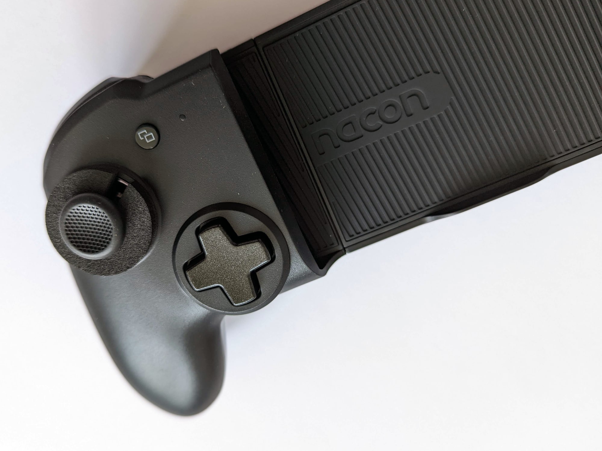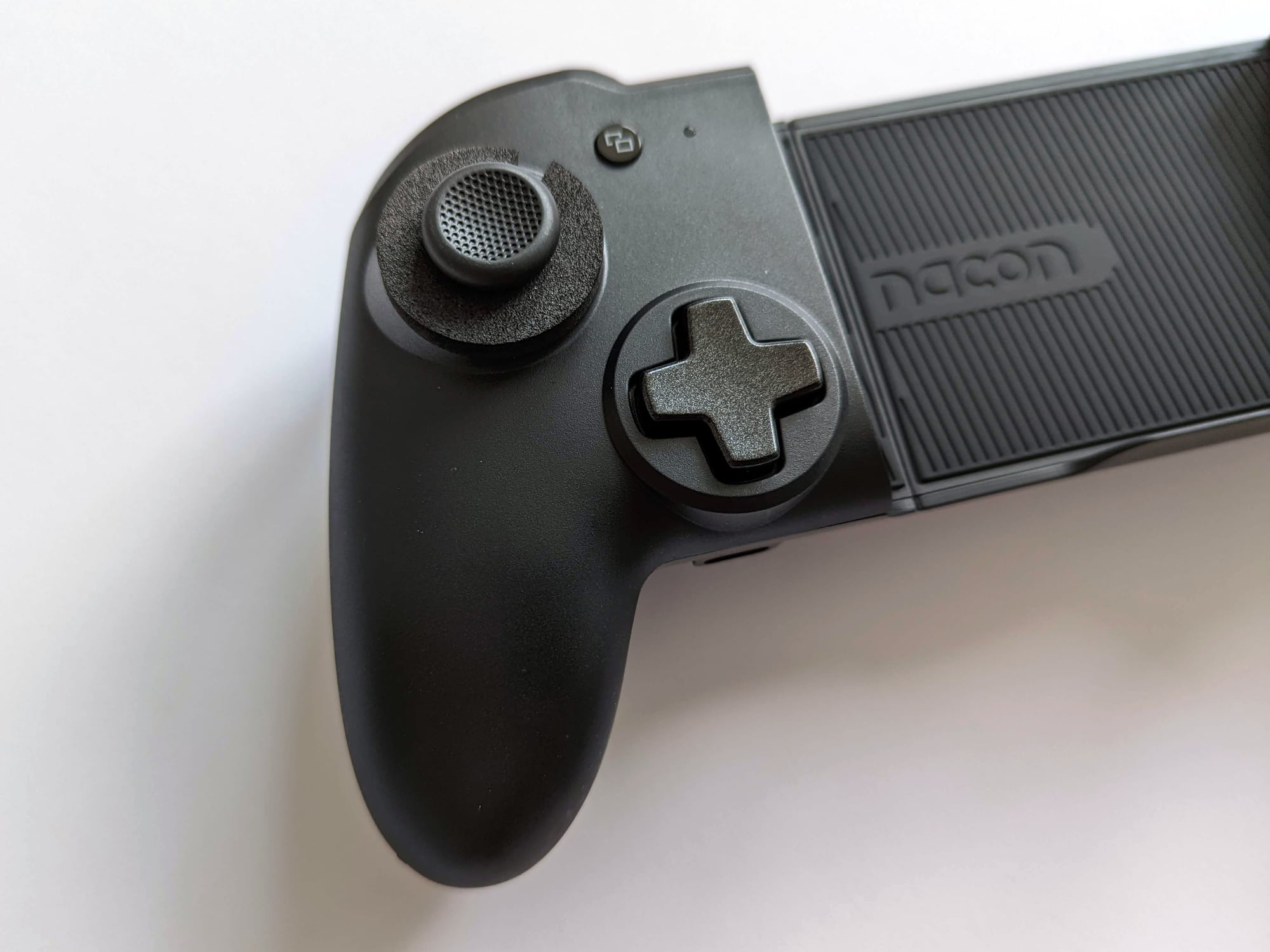 Die Oberseite des Controllers ist wie bei Microsofts Original leicht strukturiert. Auf der Unterseite ist die Struktur deutlich gröber, wodurch der MG-X Pro gut und sicher in der Hand liegt. Das Steuerkreuz unseres Exemplars empfanden wir als etwas schwergängig, die Buttons und vor allem die Trigger können dagegen rundum überzeugen und erinnern stark an den Microsoft-Controller. Etwas ärgerlich ist auch, dass die Thumbsticks zwar oben strukturiert sind, links mit einem simplen Muster, rechts mit dem Nacon-Logo, man aber an den Rändern darauf verzichtet hat. Die Smartphone-Halterung wirkt durchdacht und ist an allen drei Seiten gummiert. Eine kleine Kunststoff-Halterung verhindert zudem das Rausrutschen des Smartphones nach unten. Insgesamt sind Materialqualität und Verarbeitung des Controllers gut, es gibt keine unsauberen Kanten, nichts klappert oder wackelt auch nur minimal.