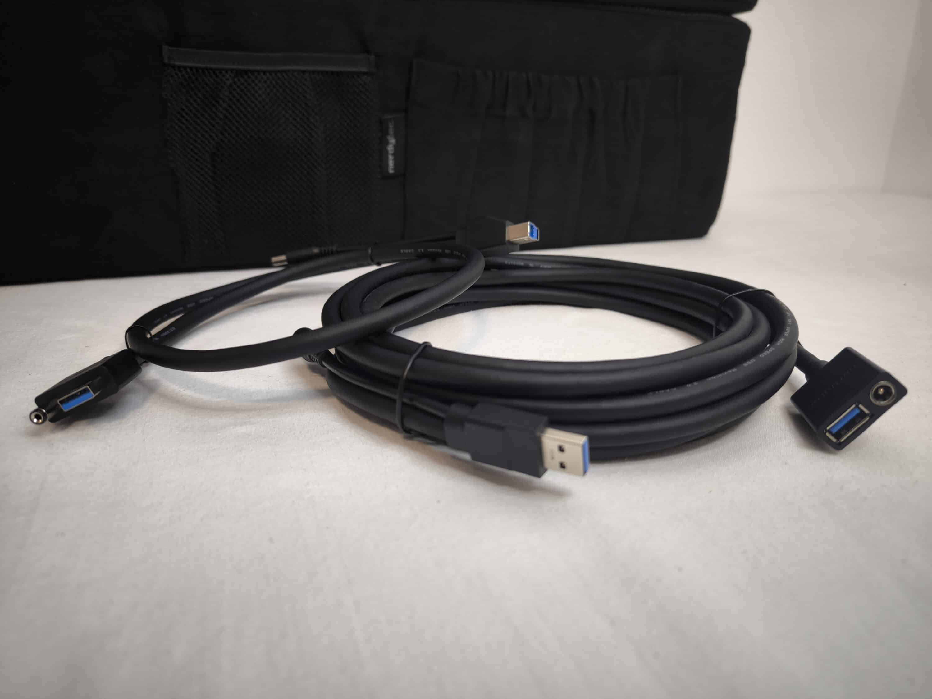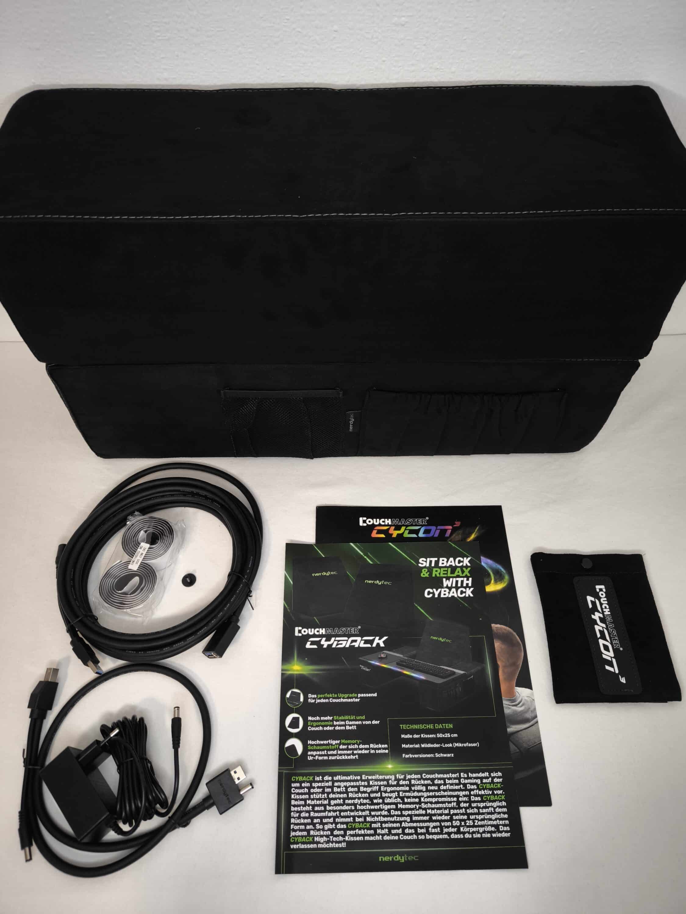 Zurück zum Couchmaster CYCON³. Enthalten sind neben der Auflage ebenfalls die beiden Stützkissen. Hinzu kommen eine Maustasche, ein Gaming-Mauspad und 1 Meter selbstklebendes Klettband. Um dem Nerdytec Couchmaster CYCON³ Leben einzuhauchen, wird selbstverständlich auch ein Netzteil mit 3 Meter Kabellänge mitgeliefert. Die Anbindung an den PC erfolgt über zwei weitere Kabel, die sich in ein 0,8 Meter langes Hub-Anschlusskabel sowie eine 5 Meter lange USB 3.0-Verlängerung aufteilen. Wie gewohnt darf natürlich die Bedienungsanleitung ebenfalls nicht fehlen. Zur Sicherheit legt Nerdytec außerdem eine Ersatzschraube bei.