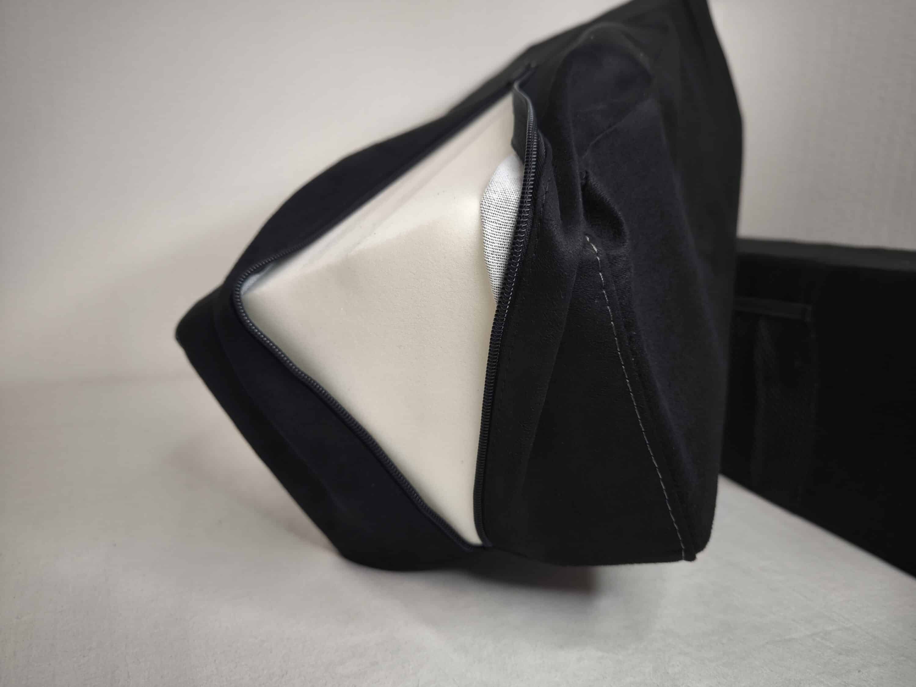 Gegenüber dem Vorgänger (unser Test) wurde das Grundkonzept optisch beibehalten und durch einige Erweiterungen sinnvoll ergänzt. So besteht der Nerdytec Couchmaster CYCON³ nach wie vor aus drei Einzelkomponenten. Die beiden Bezüge der Stützkissen bestehen aus Mikrofaser in Wildlederoptik, die Füllung aus Kaltschaum mit Memory-Effekt. Das Herzstück ist natürlich die Auflage, welche aus überwiegend Kunststoff besteht und locker auf den Stützkissen aufliegt. Je nach Bedarf kann hier der Abstand variiert werden, wobei der maximale Innenabstand der Kissen 75 cm beträgt.