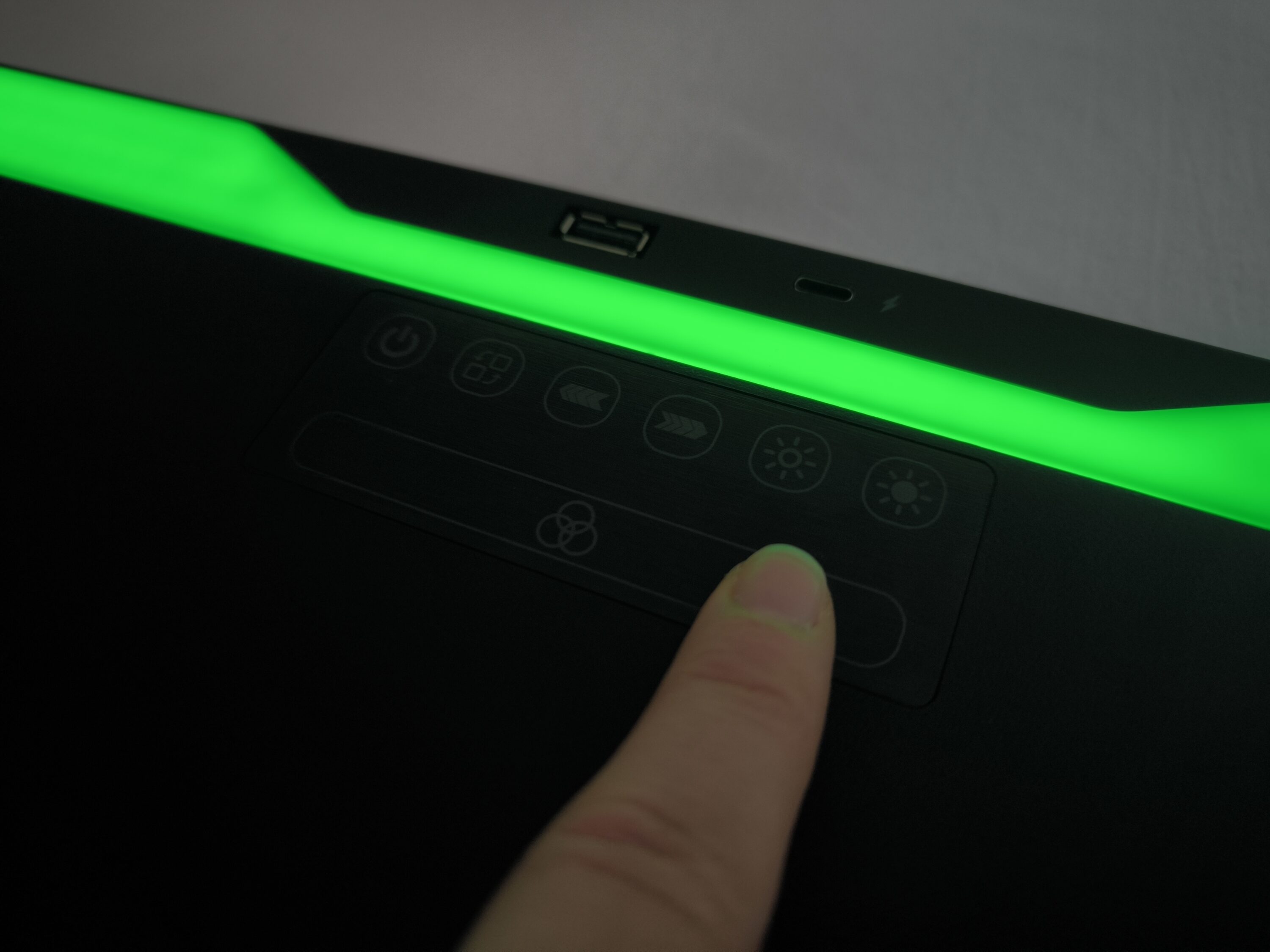 Optisch ist die Auflage definitiv ein Hingucker und gerade mit der aktiven HORIZONLIGHT-Bar kommt die gewohnte Gaming-Atmosphäre auf. Das Touchpanel, welches zur Steuerung der cleveren Auflage dient, erlaubt die Auswahl diverser LED-Modi samt Geschwindigkeit und Helligkeit in fünf Stufen. Neben einfarbigen Varianten stehen auch elf bunte Effekte zur Auswahl. Per Schieberegler lassen sich alternativ die RGB-Farben regulieren. Wer mit solchen Lichtspielen generell nichts anfangen kann und lieber einen schlichten Desk vorzieht, kann die HORIZONLIGHT-Bar bei Bedarf ausschalten.