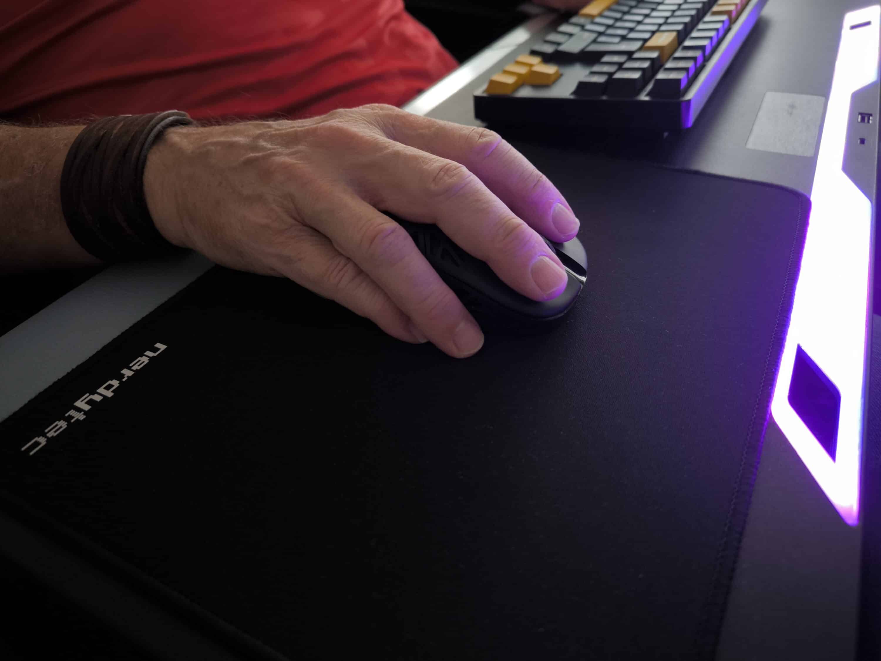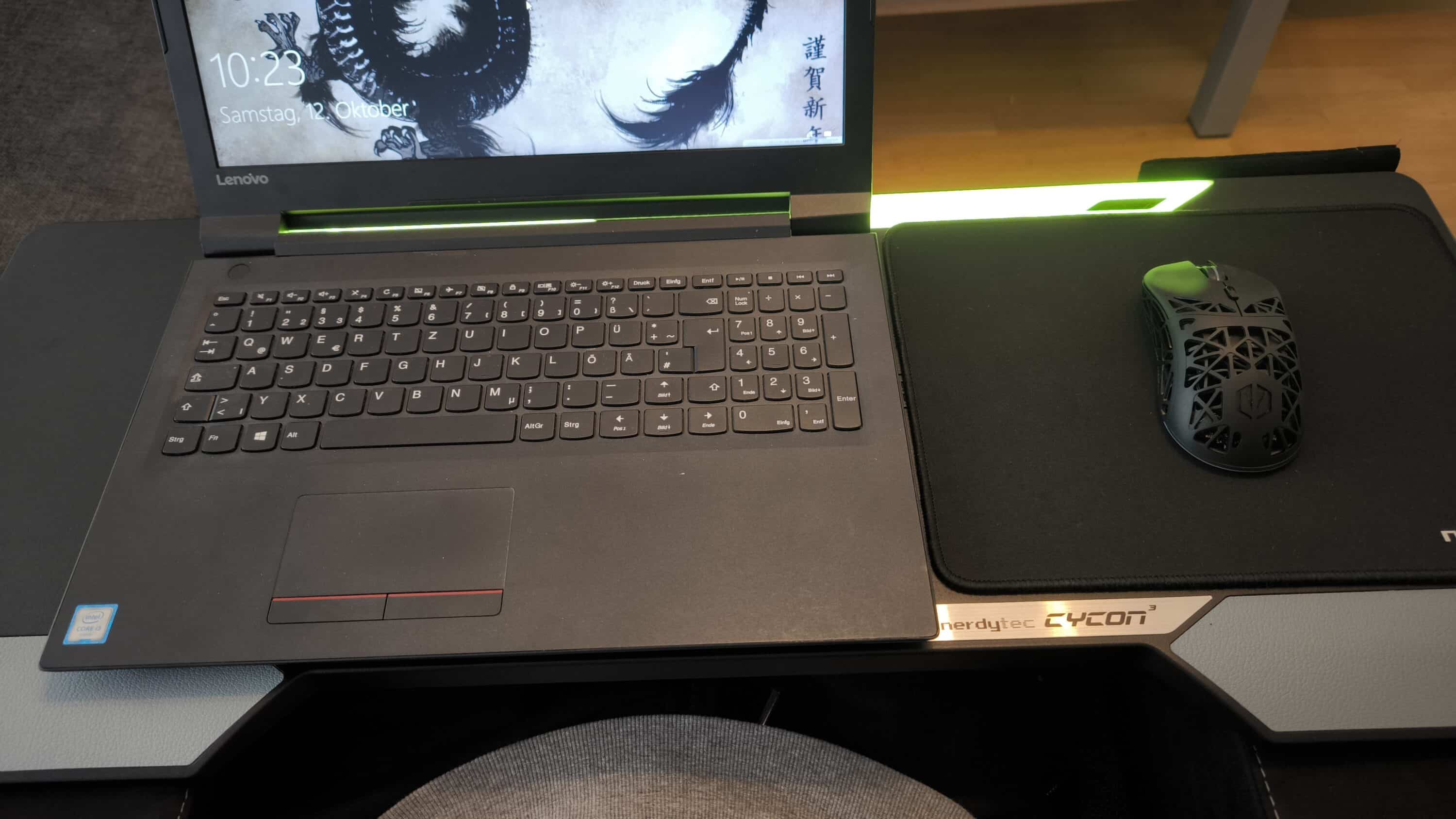 Aus ergonomischer Sicht passt es in Verbindung mit dem CYBACK definitiv, allerdings fällt hier vermutlich das etwas zu große Mauspad ins Gewicht. Steht der Laptop nämlich nicht in der Mitte, sondern dauerhaft zu weit links, kann es beim Tippen von z.B. Mails doch etwas lästig werden. Gleichzeitig müsste dann das Touchpanel für die HORIZONLIGHT-Bar nach rechts oder links oben rutschen, da es der Laptop sonst verdeckt und unbeabsichtigte Eingaben vorkommen. Daher ist es an dieser Stelle mit allen Funktionen nur bedingt geeignet.