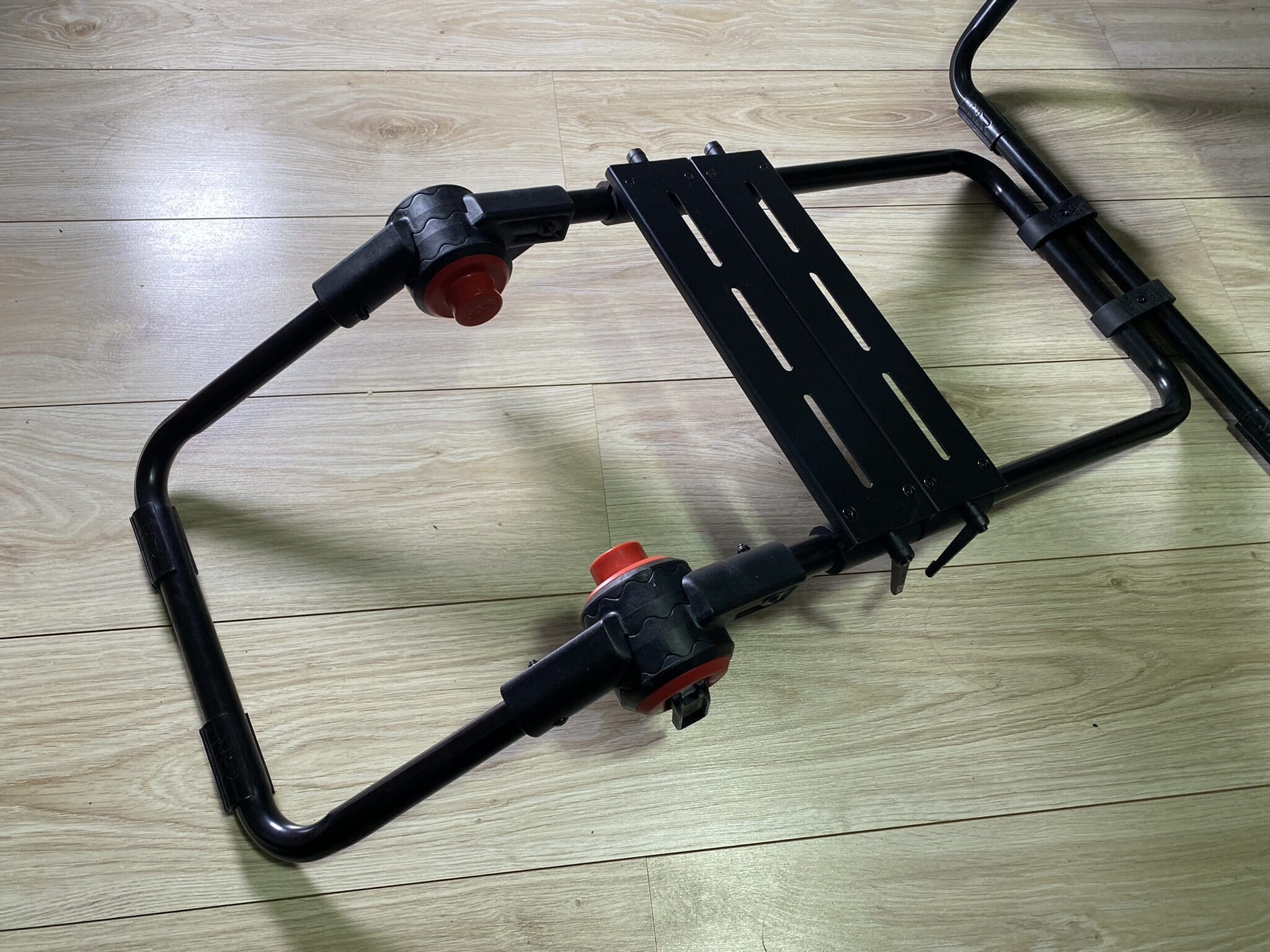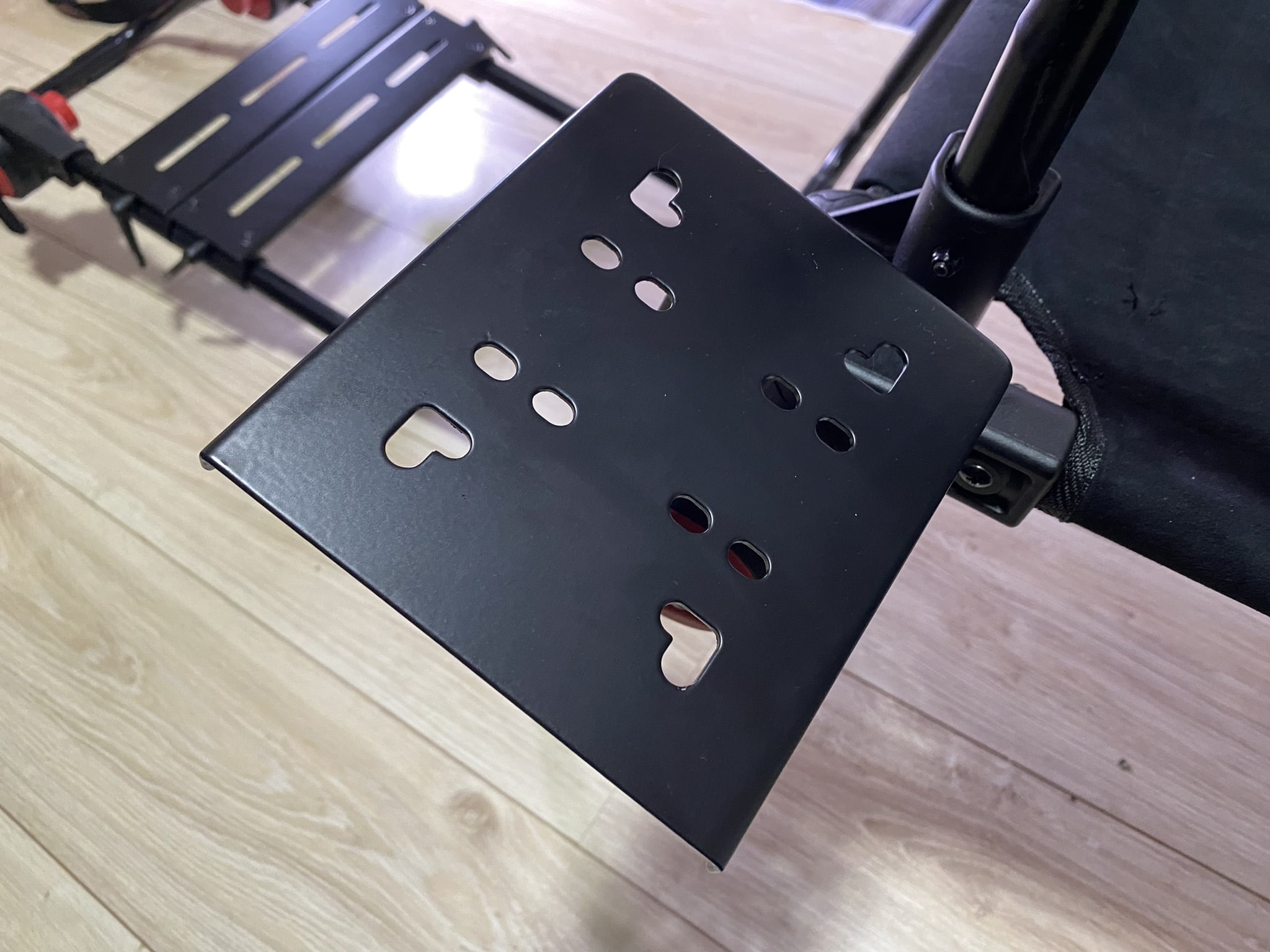 Um die Halterung der Pedalen zu befestigen, benötigt man jedoch etwas Fingerspitzengefühl und am besten eine weitere helfende Person. Zunächst schraubt man die zwei Klammern, welche schon an der Halterung hängen, ab und legt in die Klammer die beiden Stangen von der Halterung und des restlichen Stuhls ein. Dann muss von oben eine Schraube in die Klammer geschraubt werden, die mit einer Mutter auf der unteren Seite fest gezogen wird. Problematisch ist dabei die Mutter. Leider ist diese nicht in der Klammer befestigt sondern lose in einem Loch, bei dem man auch nicht die Gravitation zu seinem Vorteil nutzen kann. Mit einer zweiten Person, die einem den Stuhl etwas hochhält, ist das aber kein Problem mehr. Nun ist man an dem Punkt, wo man das eigene Equipment am Racing-Stuhl befestigen kann und man schon fast loslegen kann.