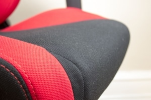 Das Produktdatenblatt des S300 lässt schon vorab auf einiges hoffen, denn schon der Stoffbezug deutet auf ein hochwertiges Produkt hin. Der Bezug ist super verarbeitet, gerade und saubere Nähte sorgen für ein gutes Gesamtbild. Außerdem können wir keine offenen Maschen finden. Die Sitzfläche und Seitenwangen haben einen leichten Übergang, was für einen guten Sitz und größtmögliche Beinfreiheit sorgt. Für angenehmen Sitzkomfort sorgt der hochverdichtete Kaltschaum.