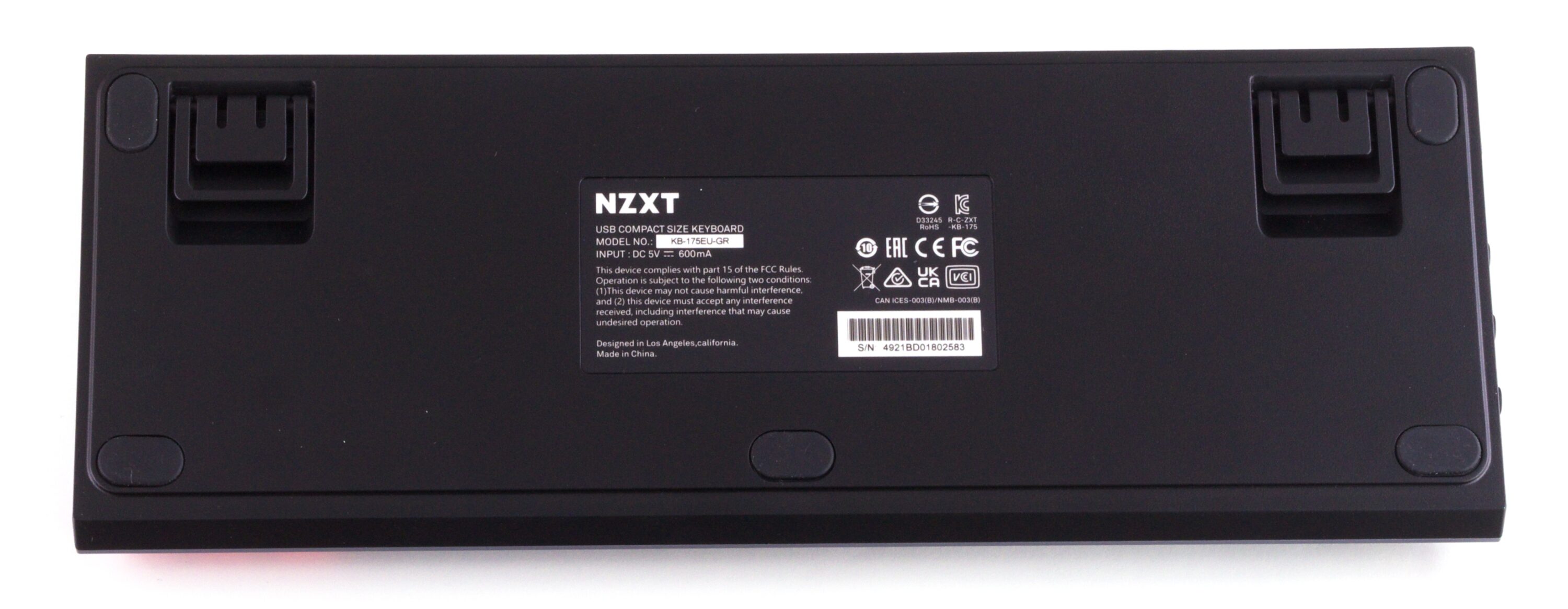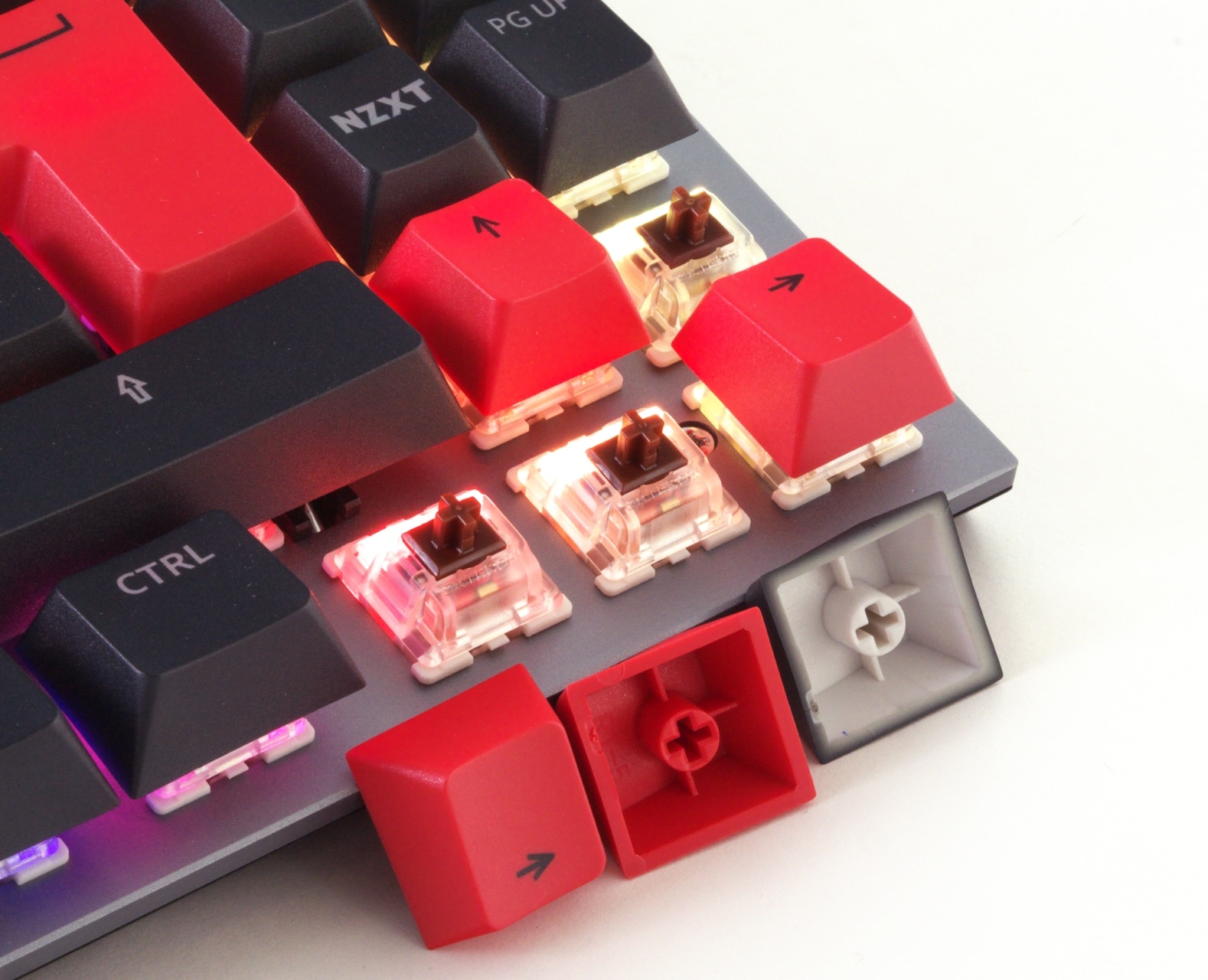 An der Oberseite der Tastatur befinden sich abseits der Tasten lediglich noch ein farblich hervorgehobenes Herstellerlogo, zwei zusätzliche Signal- sowie die drei üblichen Status-LEDs, die in weiß leuchten. Bei weiteren Verzierungen hält sich NZXT hingegen zurück: Die Function ist sehr schlicht und aufgeräumt gestaltet. Die Oberseite wird dabei komplett von einer Metallplatte aus eingefärbtem Aluminium bedeckt, und darunter lässt sich, wenn man eine der Tasten ausbaut, das PCB mit der RGB-LED und den Anschlussbuchsen erkennen. Diese werden für den Austausch der Switches benötigt.