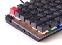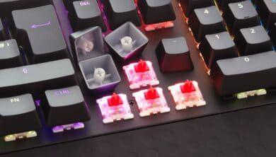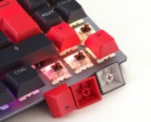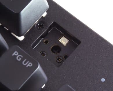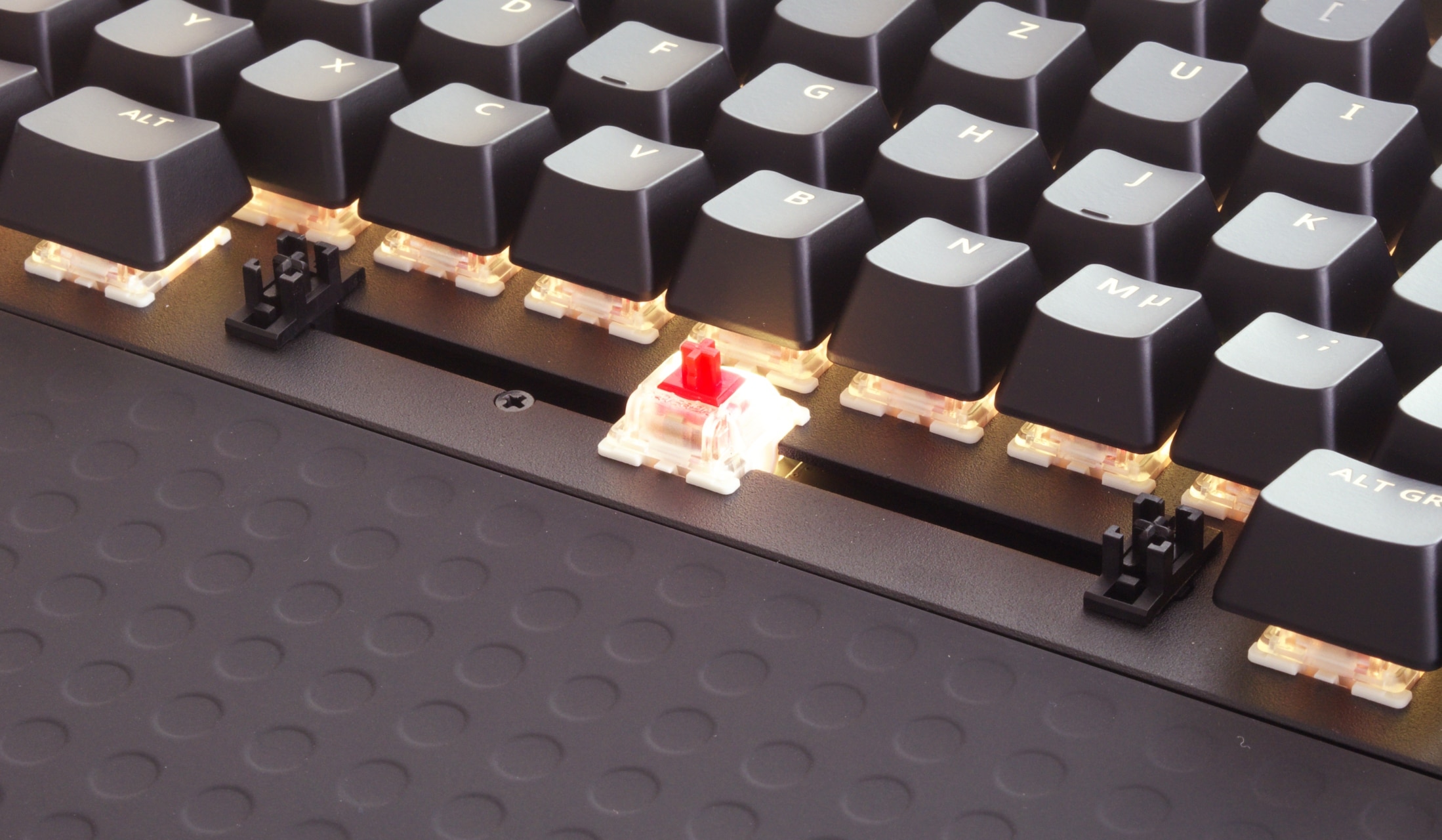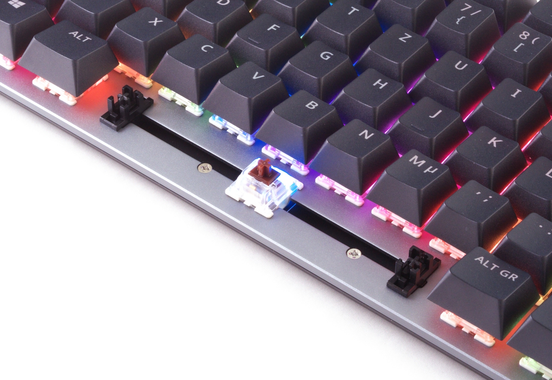 Aufgrund der auf dem PCB verlöteten RGB-LED sollte man dabei idealerweise einen Switch mit transparentem Gehäuse wählen, um das Licht nicht zu verdecken. Prinzipiell lassen sich aber alle zu den MX-Switches kompatiblen Taster einbauen. Somit kann man beispielsweise auftretende Defekte beheben, Veränderungen an den Switches vornehmen oder auch das Tippgefühl durch das partielle Einsetzen anderer Switches verändern. Für viele Nutzer mag das unnötig erscheinen, doch je nach Anwendungsfall kann beispielsweise eine Kombination aus linearer und taktiler Switches durchaus einen Vorteil bringen, um Fehleingaben zu vermeiden oder zumindest das Tippgefühl zu verbessern. Eine mögliche Konfiguration sind beispielsweise Switches mit höherer Auslösekraft, die man für die Windows- oder Capslock-Tasten verwendet, um eine versehentliche Auslösung bemerkbar zu machen.