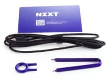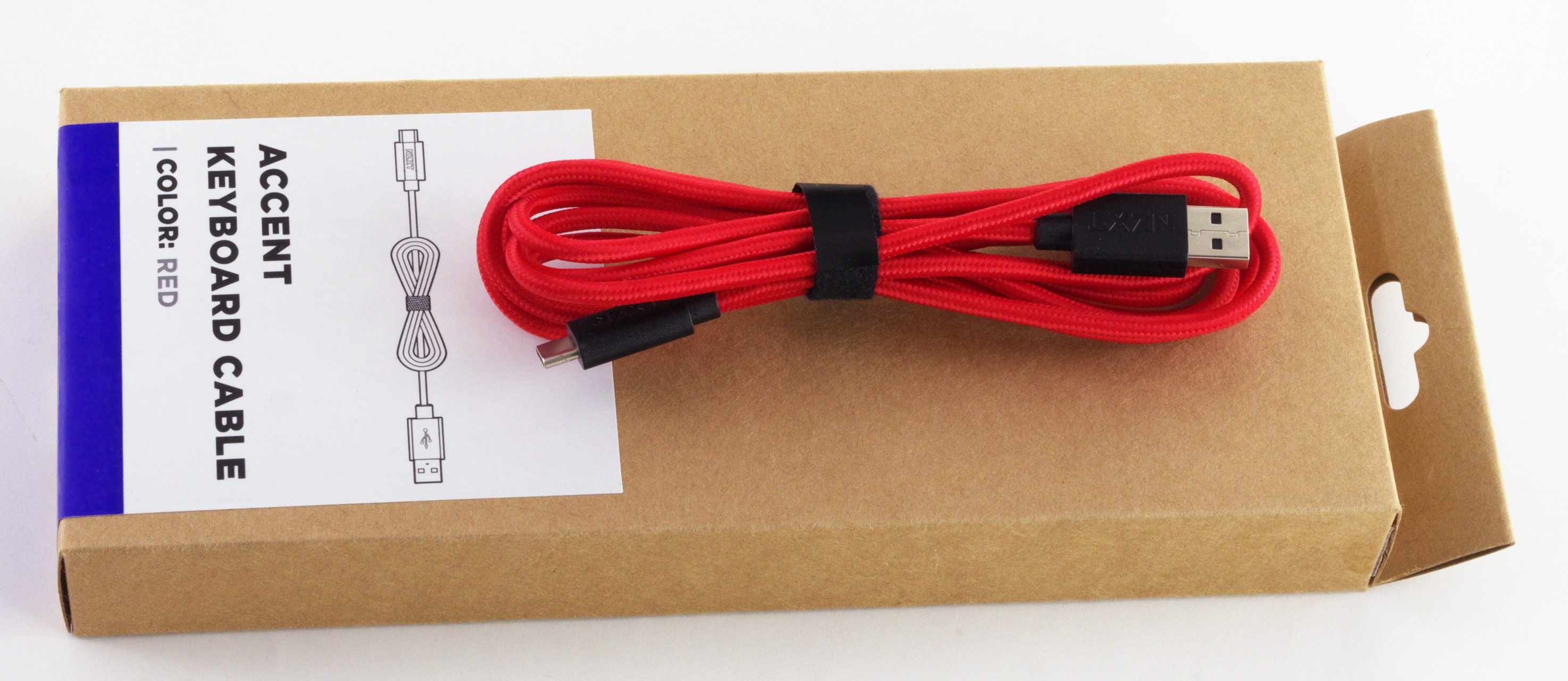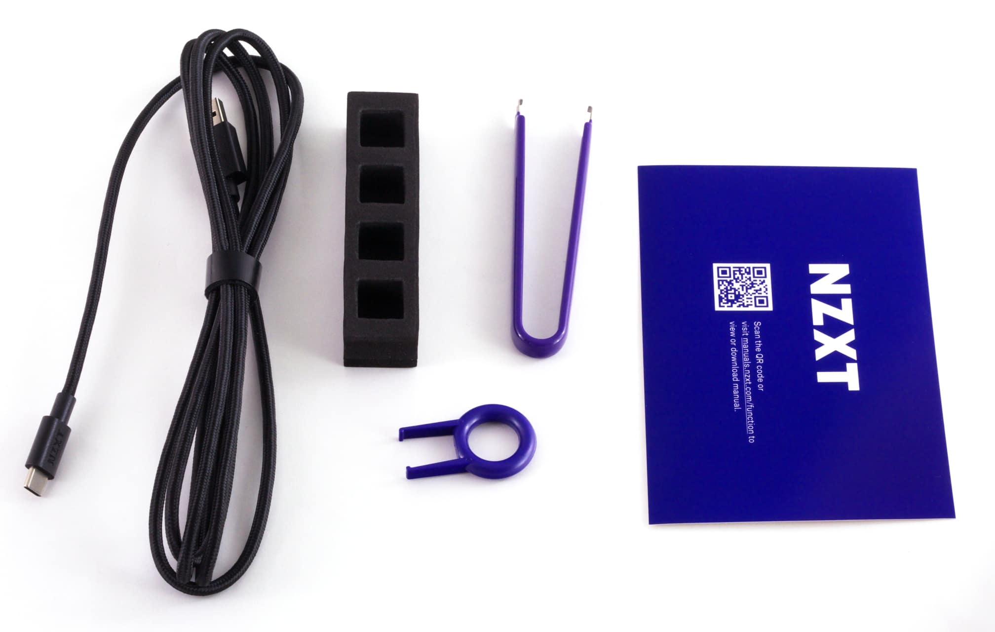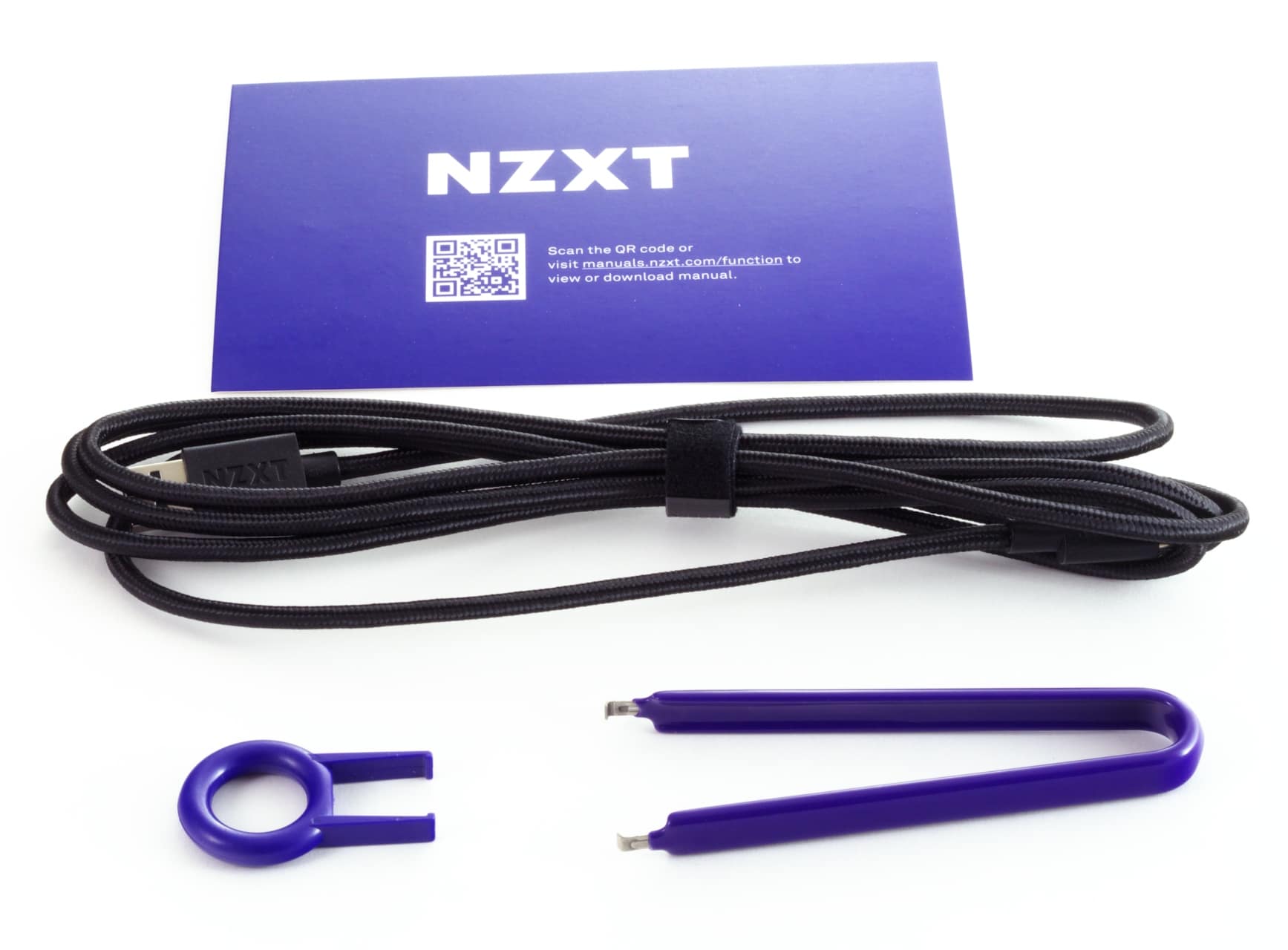 Die NZXT Function wird in einem Pappkarton in farbig bedruckter Umverpackung geliefert. Darin befinden sich, neben der Tastatur und der Handballenauflage, ein 2 Meter langes, gesleevtes USB-C-Kabel sowie zwei Entfernungshilfen. Einerseits gibt es einen der üblichen Kunststoff-Tastenkappenentferner. Andererseits liegt eine ummantelte Metallpinzette bei, mit der die Switches selbst entfernt werden können.