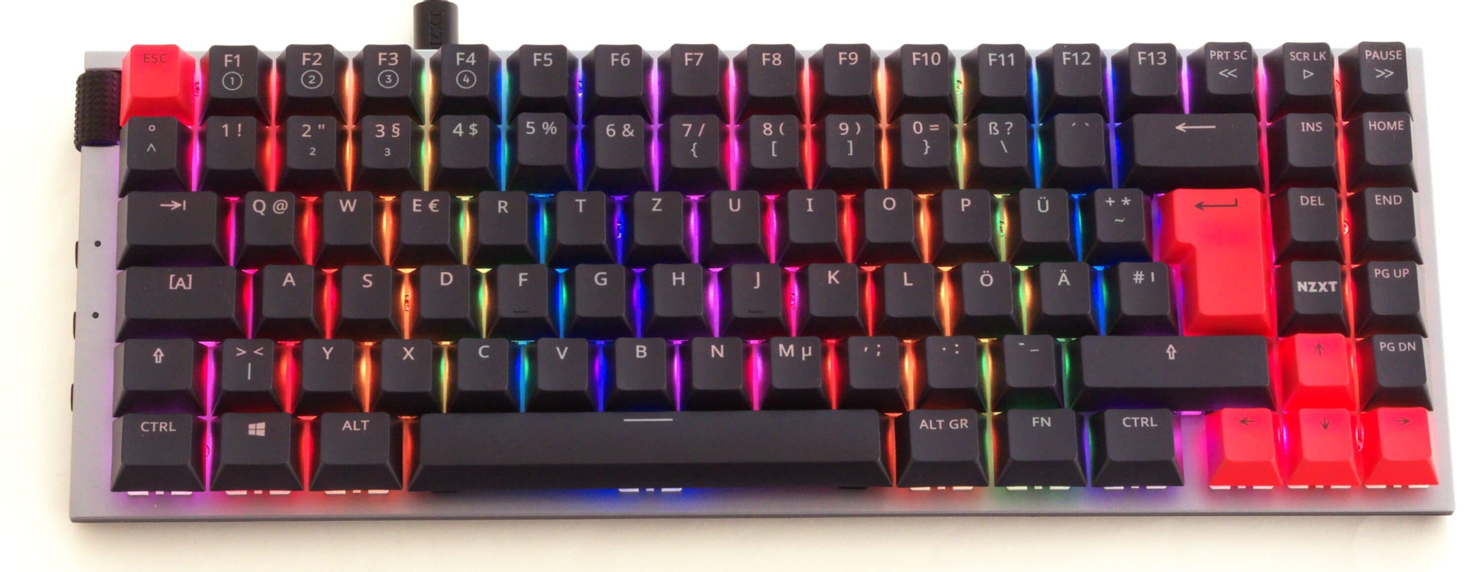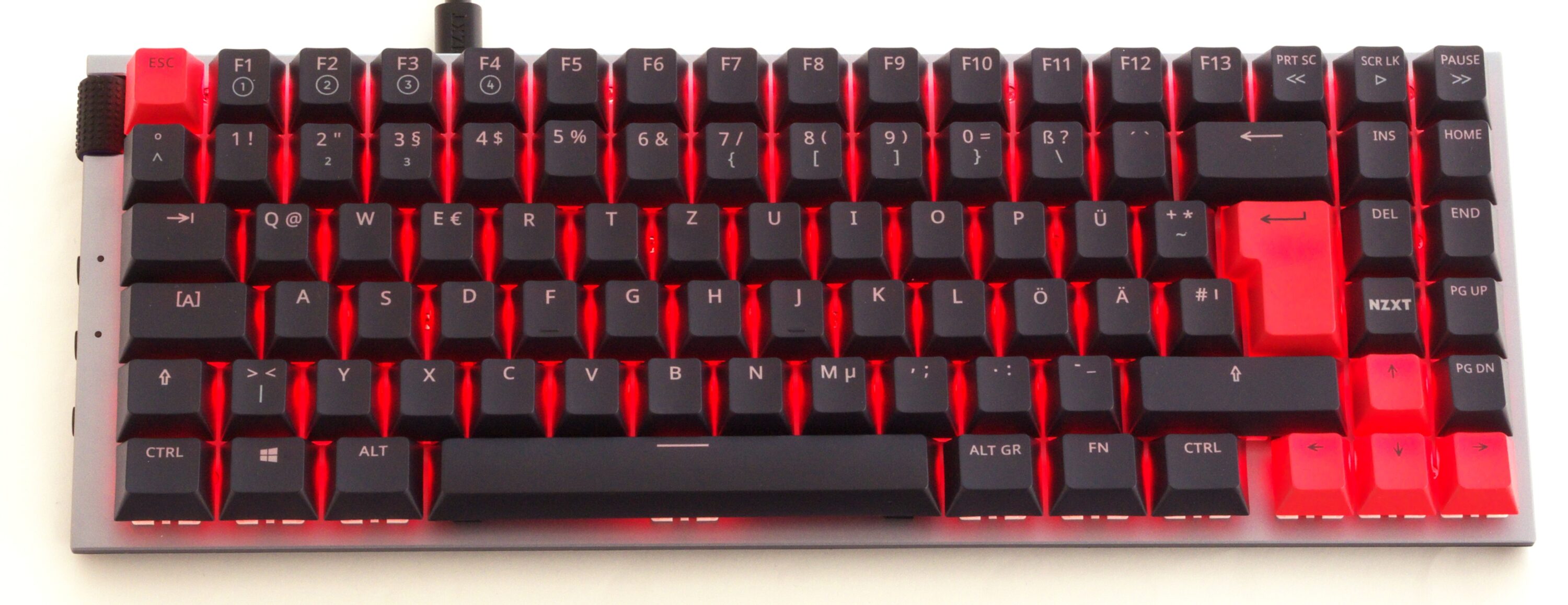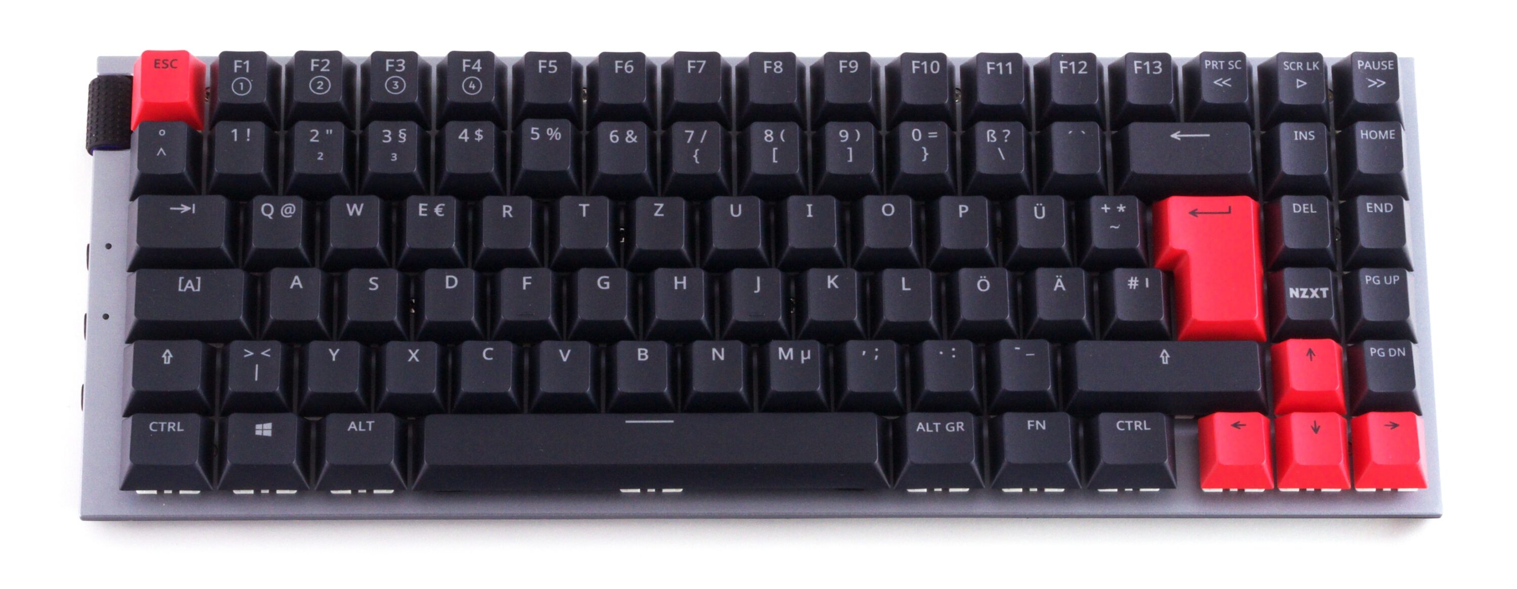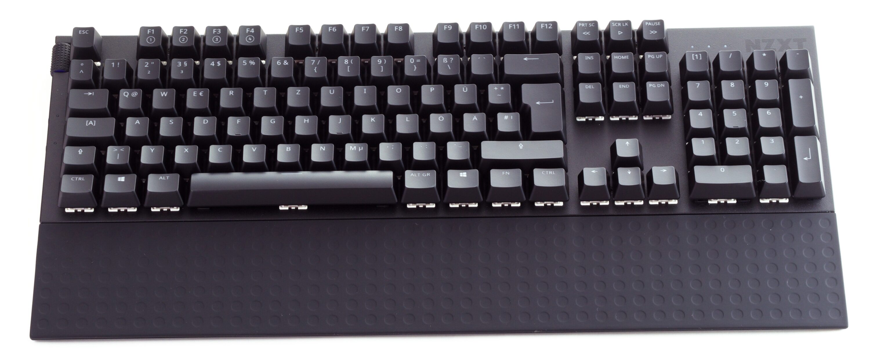 Die NZXT Function setzt im Kern auf ein übliches 100%-Layout, bei dem einige Zusatzfunktionen über eine FN-Funktion realisiert werden. Außerdem wird das Layout durch ein Lautstärkerad und drei Zusatztasten an der linken Seite ergänzt. Über letztere werden dabei eine Mute-, Helligkeits- sowie Winlock-Funktion realisiert.