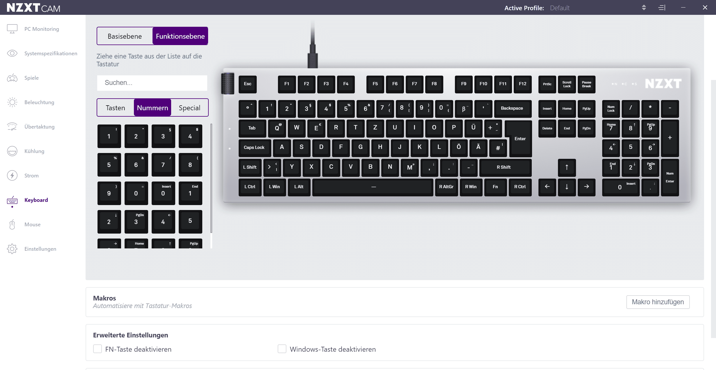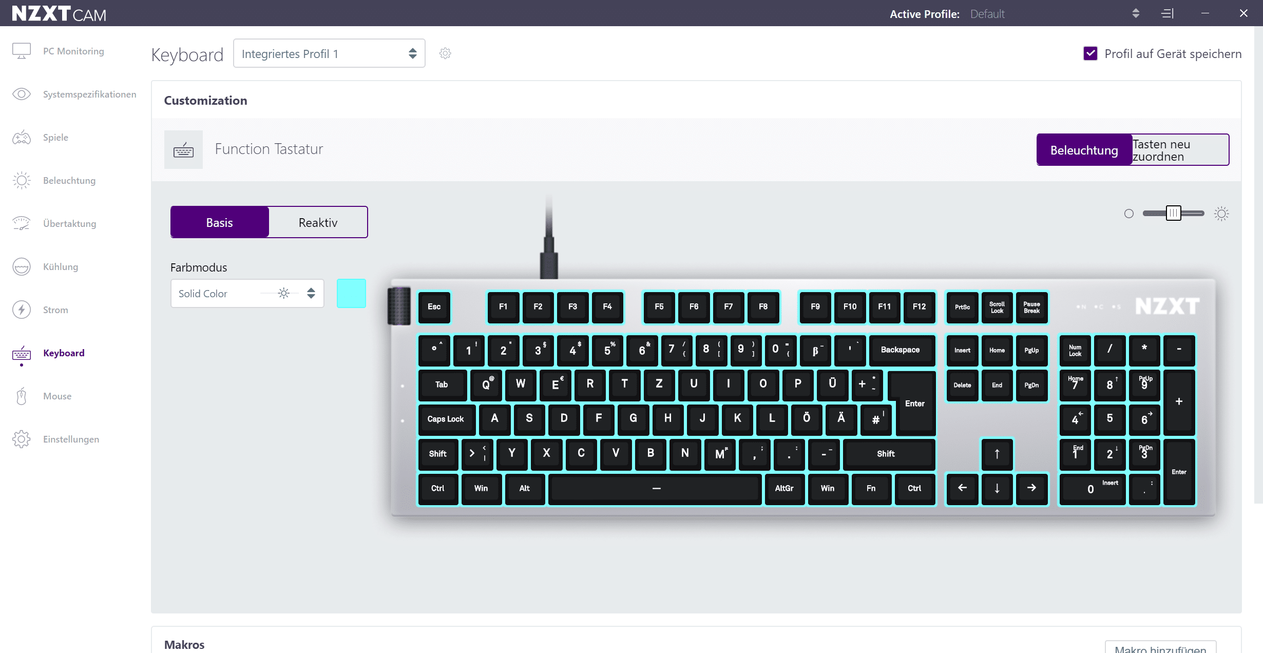 Eine hohe Einstellungsvielfalt gibt es auch bei den Tastenfunktionen: Alle mechanischen Tasten können in NZXTs Software mit anderen Tastatur- und Multimediafunktionen belegt werden. Zudem stehen auch Makros mit über 100 Zeichen zur Verfügung, die, wie die aktuelle Beleuchtungseinstellung, im internen Speicher der NZXT Function gespeichert werden. Sobald die Tastatur einmal konfiguriert ist, kann sie also einfach an einem anderen Rechner verwendet werden, ohne die CAM erneut installieren zu müssen. Auch hier werden somit die allermeisten Ansprüche abgedeckt.