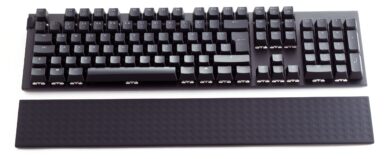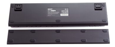 Die beiliegende Handballenauflage besteht, wie auch das Tastatur-Gehäuse selbst, aus mattschwarzem Kunststoff. Das Gehäuse besteht dabei aus mehreren Teilen, sodass im Gegensatz zu manchen günstigeren Handballenauflagen auch die Unterseite von einer glatten Kunststoffseite bedeckt wird. Auffällig ist an der Auflage außerdem die Oberseite: Hier setzt NZXT auf eine strukturierte Gummioberfläche, die wohl für das mit rund 300g recht hohe Gewicht der Handballenauflage verantwortlich sein dürfte.