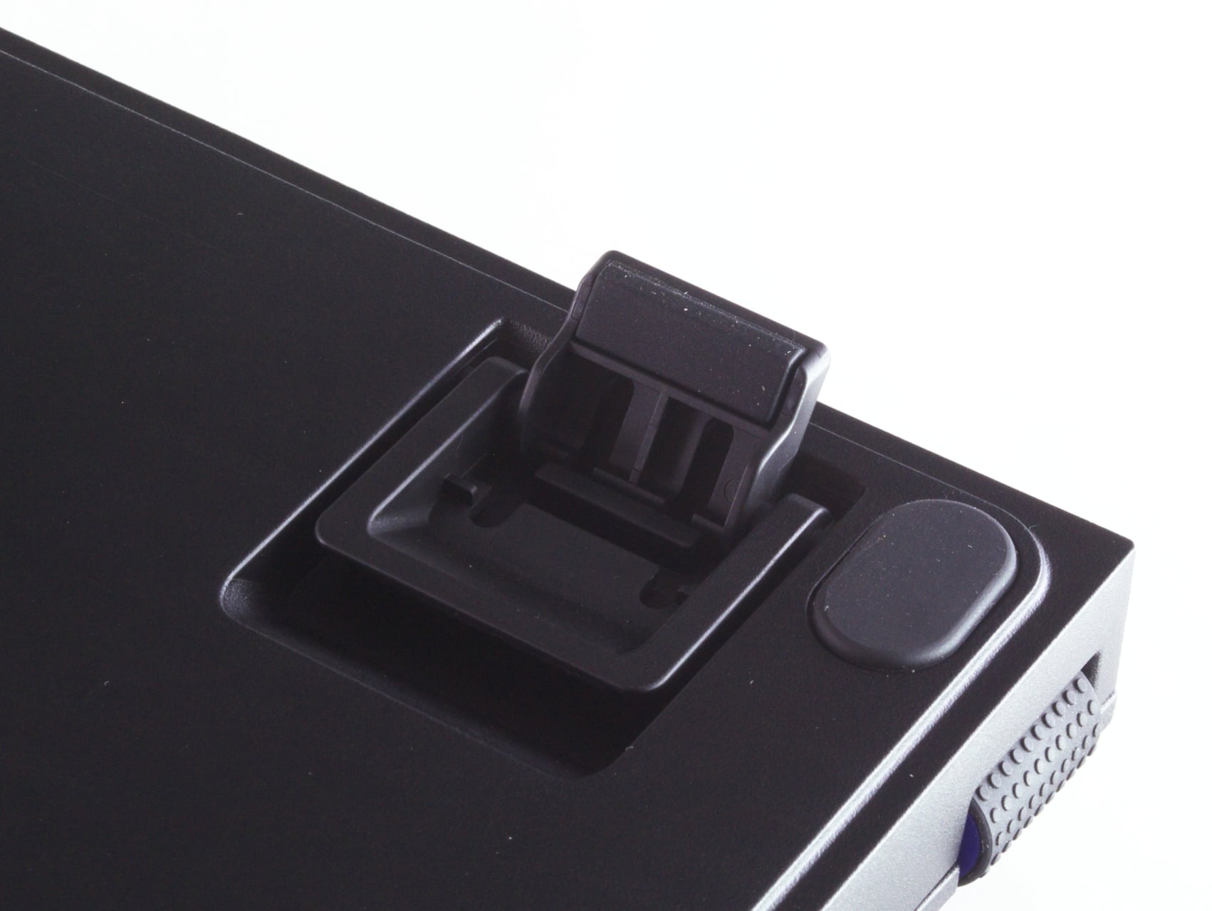 Ebenso unauffällig ist die Unterseite der Function: Die Tastatur ruht auf fünf und die Handballenauflage auf weiteren zehn Gummipads. Abseits davon ist auf der Unterseite nur noch die Höhenverstellung untergebracht, die dabei eine kleine Besonderheit darstellt: Im Gegensatz zu den meisten anderen Tastaturen ist diese bei der Function nicht ein- sondern zweistufig. Die Function kann so wahlweise um weitere 4° oder 9° hochgestellt werden.