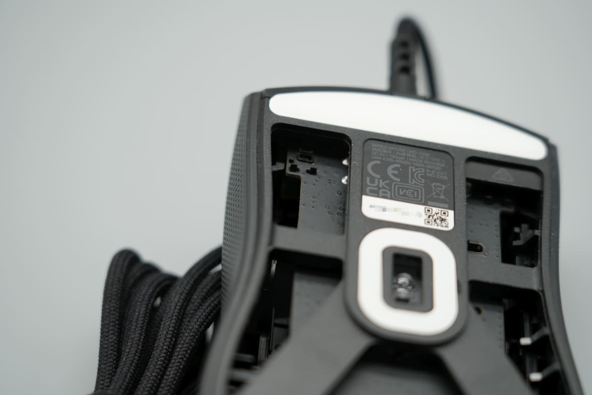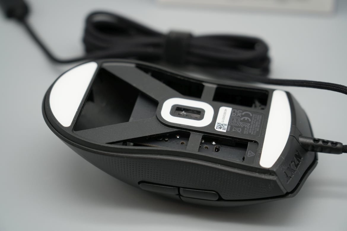 Interessant wird es an der Unterseite, denn die präsentiert sich äußerst luftig. Der mittig platzierte Sensor und die großzügigen PTFE-Gleitpads werden lediglich durch eine Art Skelett gehalten, der Rest der Unterseite ist offen.
