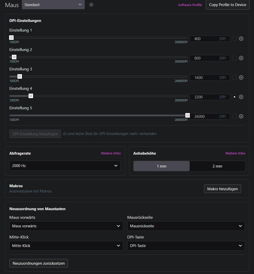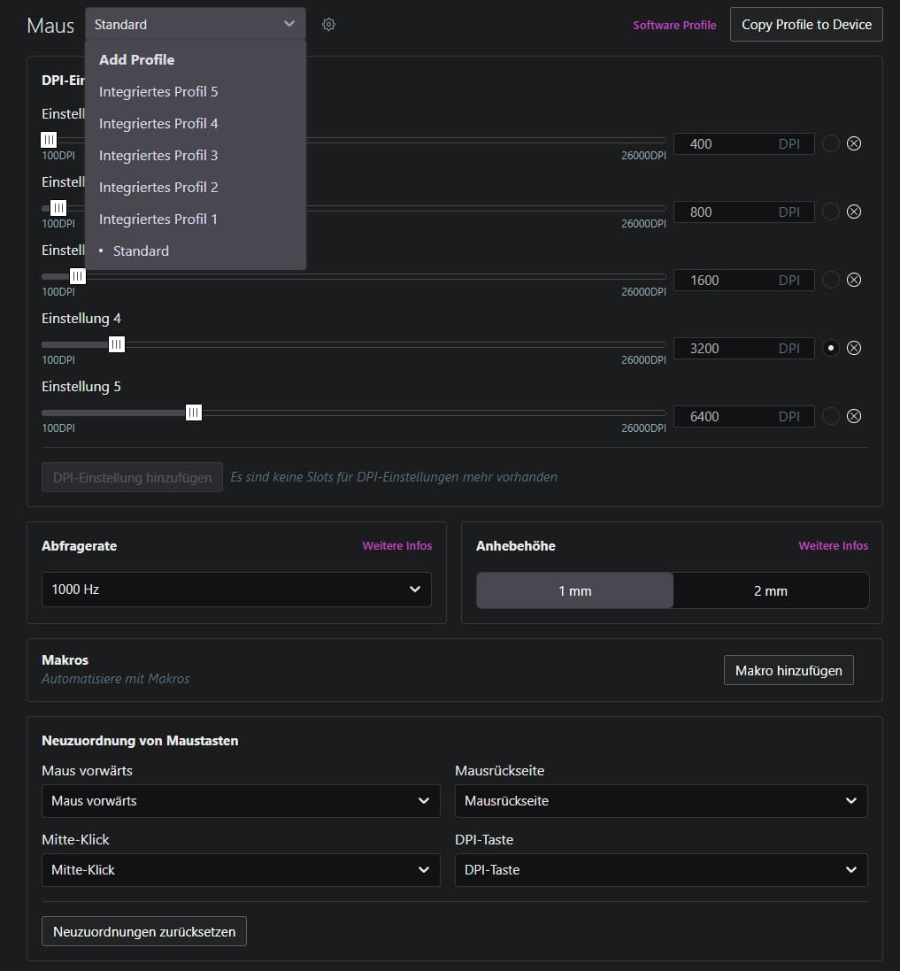 Ganz oben können wir zwischen fünf Onboard-Profilen wechseln, die wir darunter einstellen können. Los geht es mit den DPI-Einstellungen, in denen wir fünf verschiedene Settings vornehmen und die Auflösung in Schritten von 1 DPI anpassen können.