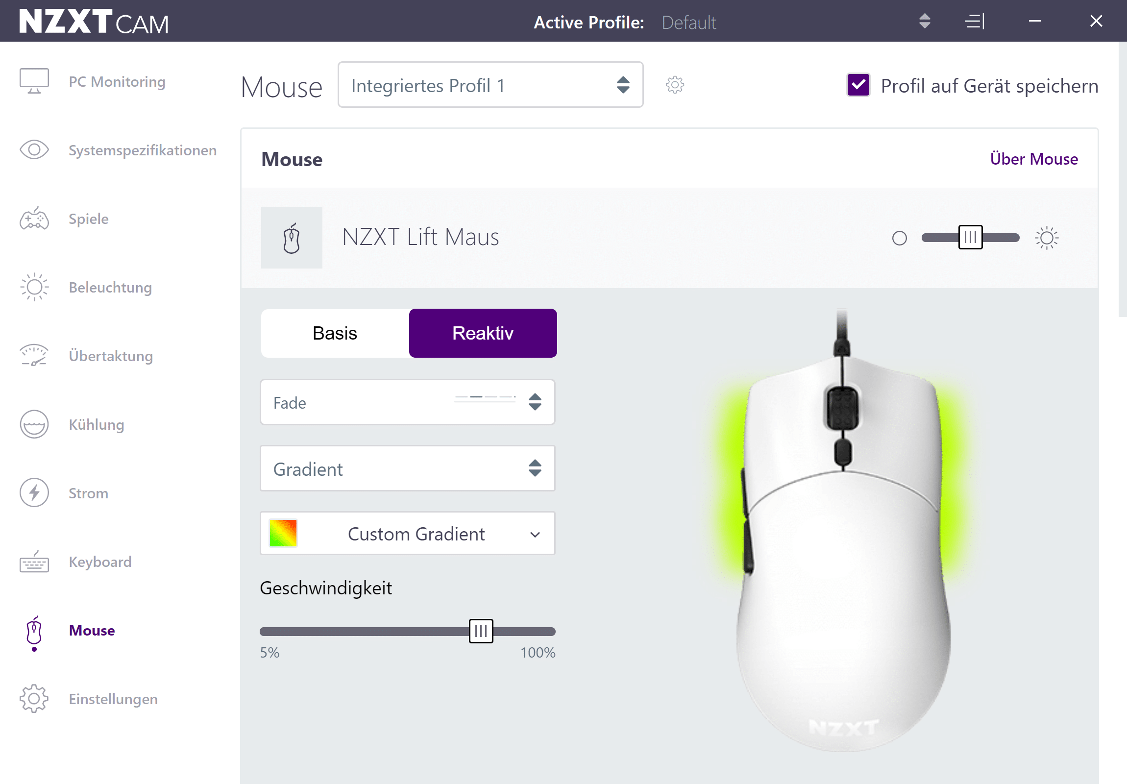 Zuletzt stehen bei der Beleuchtung der NZXT Lift mehrere statische und dynamische Effekte zur Verfügung. Diese lassen sich, wie schon bei der Function-Tastatur, überlagern. Zudem ist auch eine Anpassung mit Hinblick auf Parameter wie den Farbverlauf oder Geschwindigkeit möglich. Auch hier dürften somit alle Ansprüche abgedeckt werden. Mit Hinblick auf die Hardware-Realisierung kann die Beleuchtung zudem ebenso überzeugen: Die Ausleuchtung ist recht gleichmäßig, die LEDs arbeiten geräuschlos und die indirekte Beleuchtung der Oberfläche unter der Maus sieht sehr ansprechend aus.