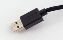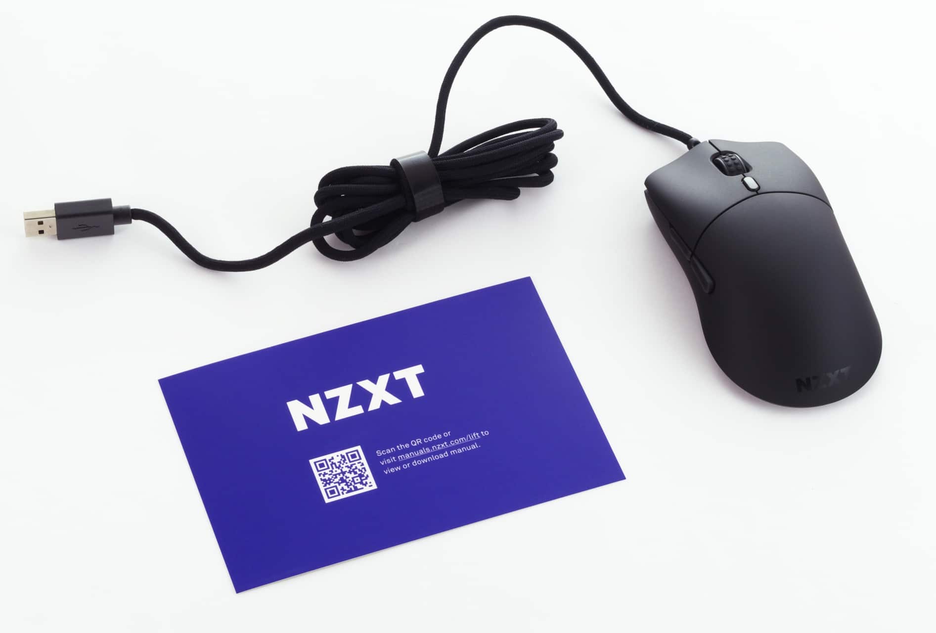Beim Zubehör der Lift gibt sich NZXT zurückhaltend. Die Maus wird in einem farbig bedruckten Karton geliefert, in dem sich neben der Maus selbst lediglich noch ein kleines Werbekärtchen befindet. Dieses verweist wiederum auf die digital bereitgestellte Anleitung. Ein weiteres Anschlusskabel ist dabei nicht notwendig: Das zwei Meter lange und gesleevte USB-Kabel ist ab Werk fest an der Maus montiert.