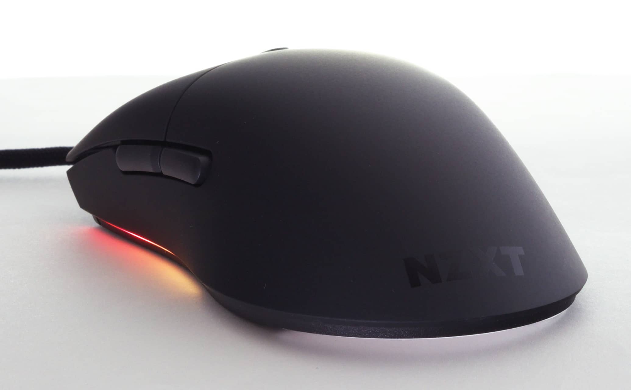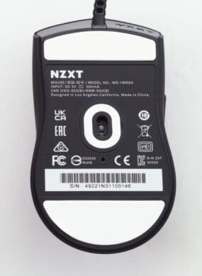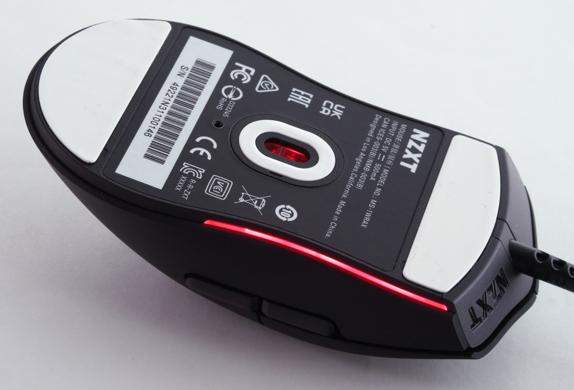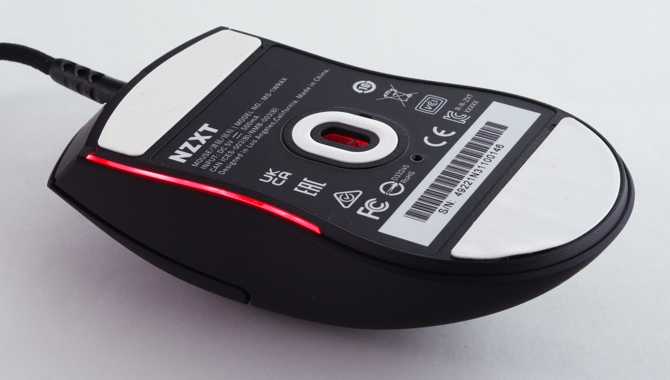Abseits von einer eventuellen Farbkombination ist die einzige von oben sichtbare Verzierung ein farblich leicht hervorgehobenes Herstellerlogo auf dem Mausrücken. Außerdem gibt es an der Lift ein ausgeschnittenes NZXT-Logo neben dem fest installierten USB-Kabel, und seitlich sind zwei Abschnitte mit transluzentem Kunststoff angebracht. Durch diese beleuchten die verbauten LEDs den Untergrund.