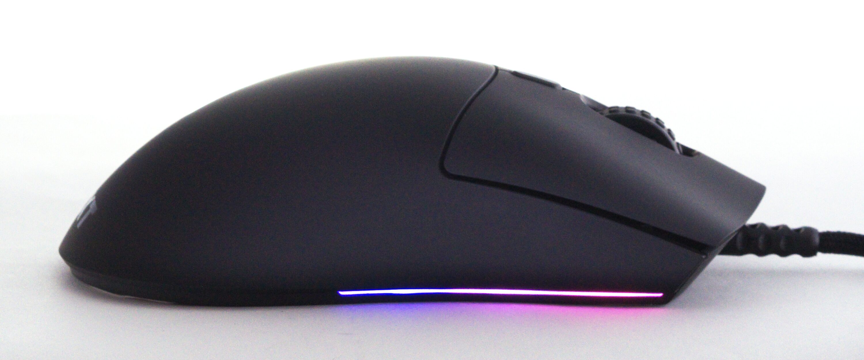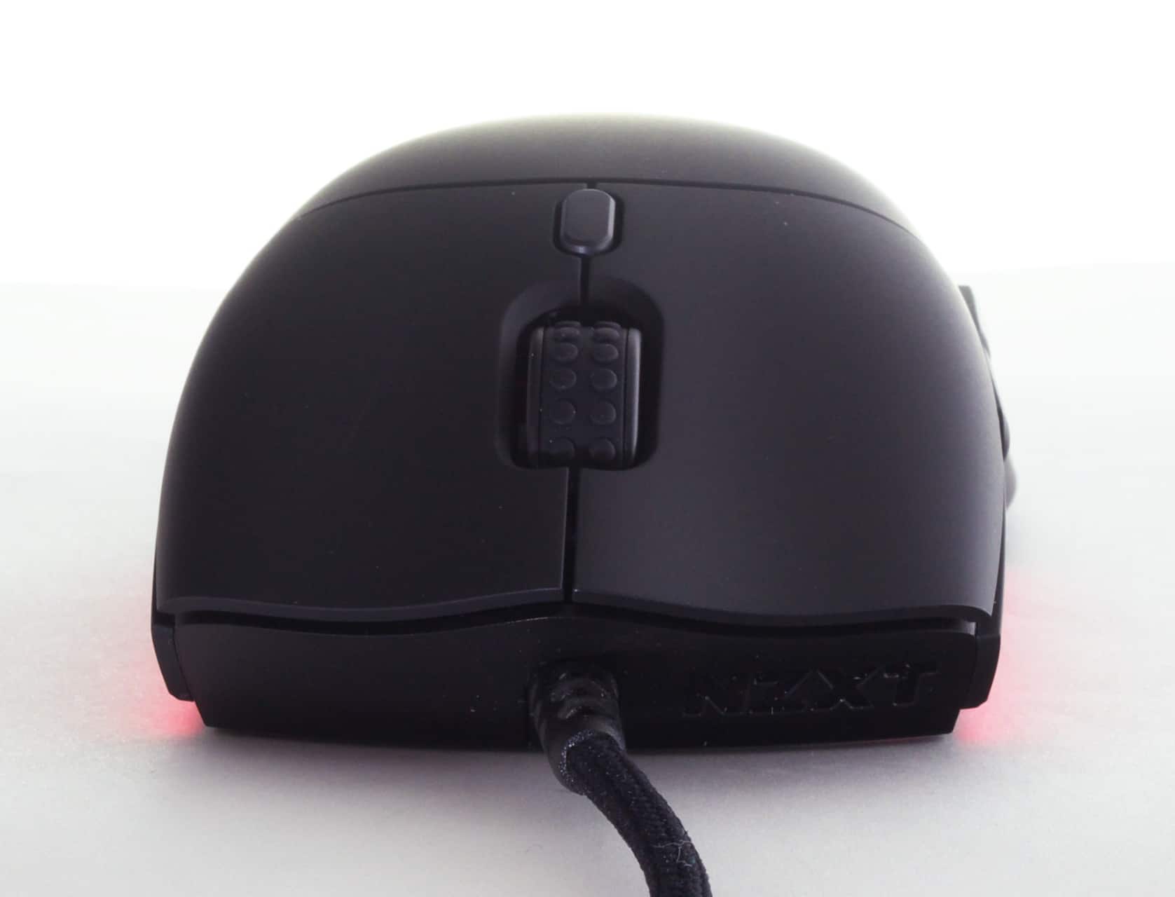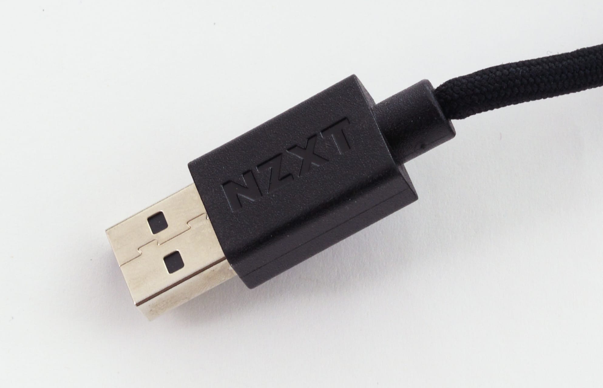 Abseits von einer eventuellen Farbkombination ist die einzige von oben sichtbare Verzierung ein farblich leicht hervorgehobenes Herstellerlogo auf dem Mausrücken. Außerdem gibt es an der Lift ein ausgeschnittenes NZXT-Logo neben dem fest installierten USB-Kabel, und seitlich sind zwei Abschnitte mit transluzentem Kunststoff angebracht. Durch diese beleuchten die verbauten LEDs den Untergrund.