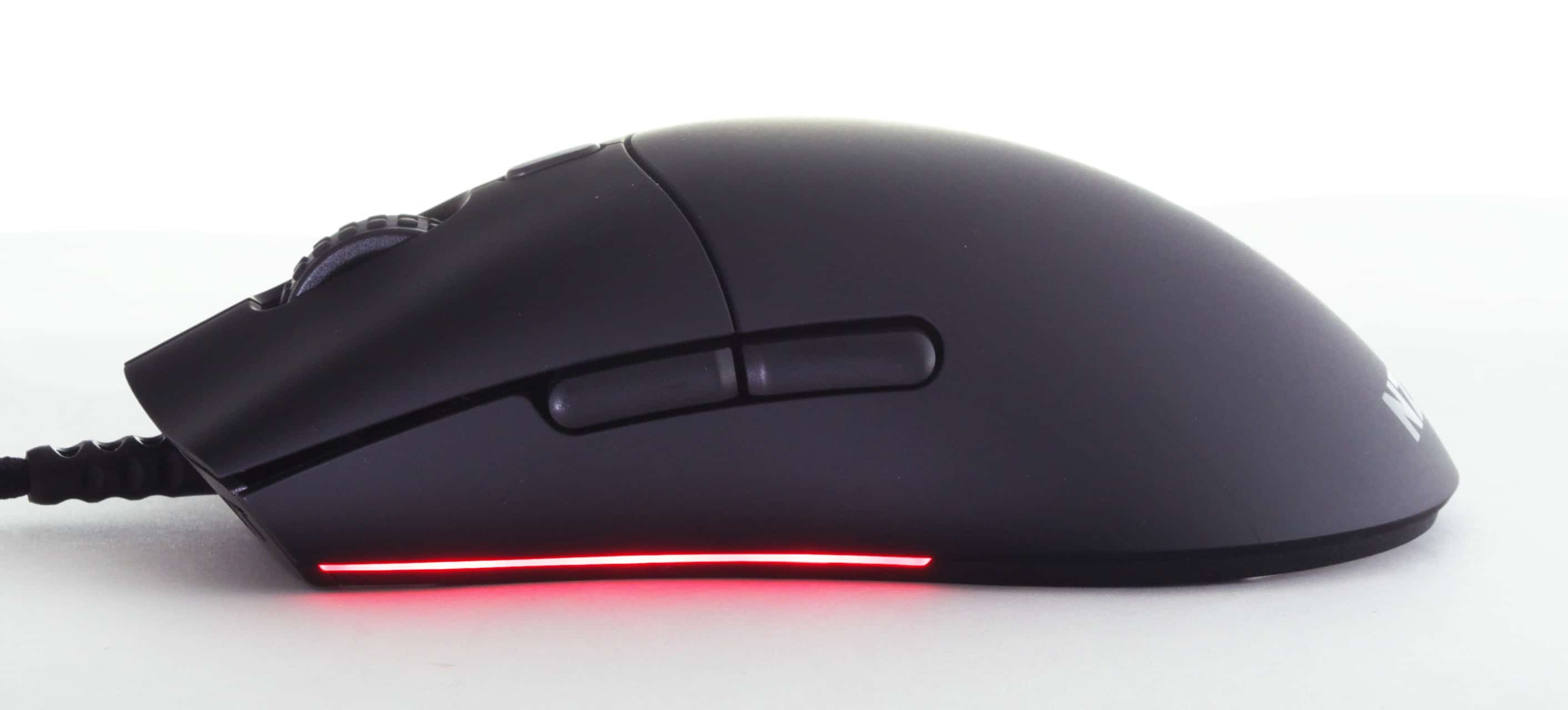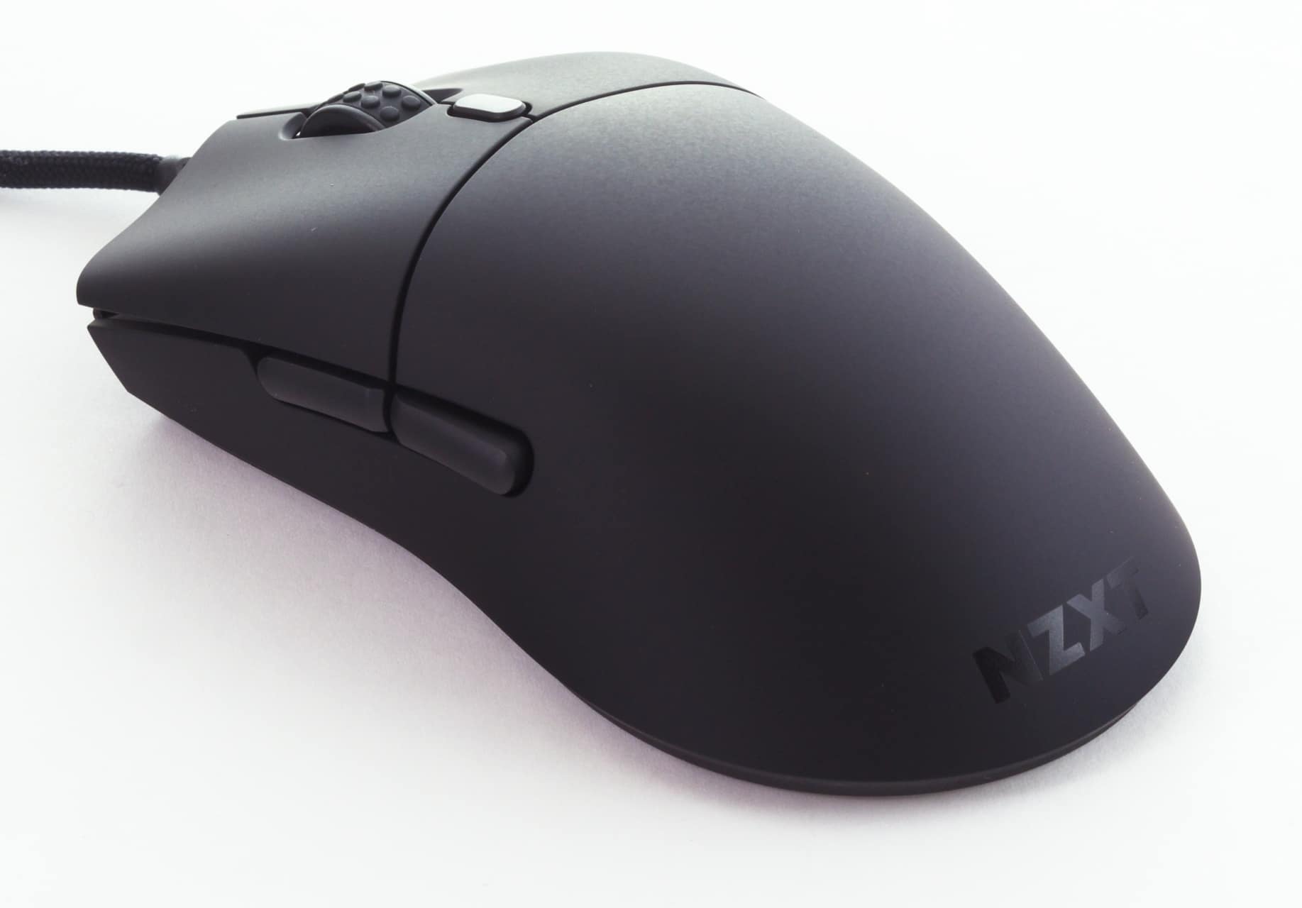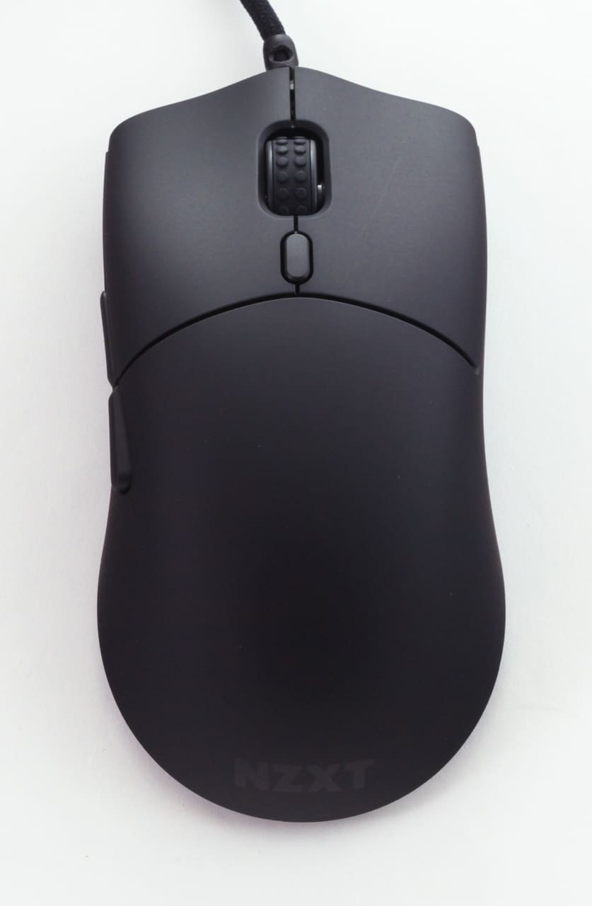 Die NZXT Lift setzt auf eine schlichte, symmetrische Gehäuseform, bei der sich die beiden Seiten einzig durch die beiden Daumentasten unterscheiden. Diese sind an der linken Seite und somit passend für Rechtshänder angebracht. Die DPI- beziehungsweise Profil-Taste befindet sich hingegen auf der Symmetrieachse – direkt hinter dem Mausrad.