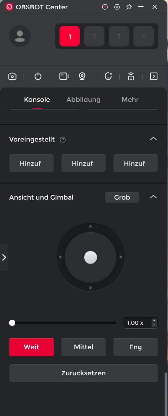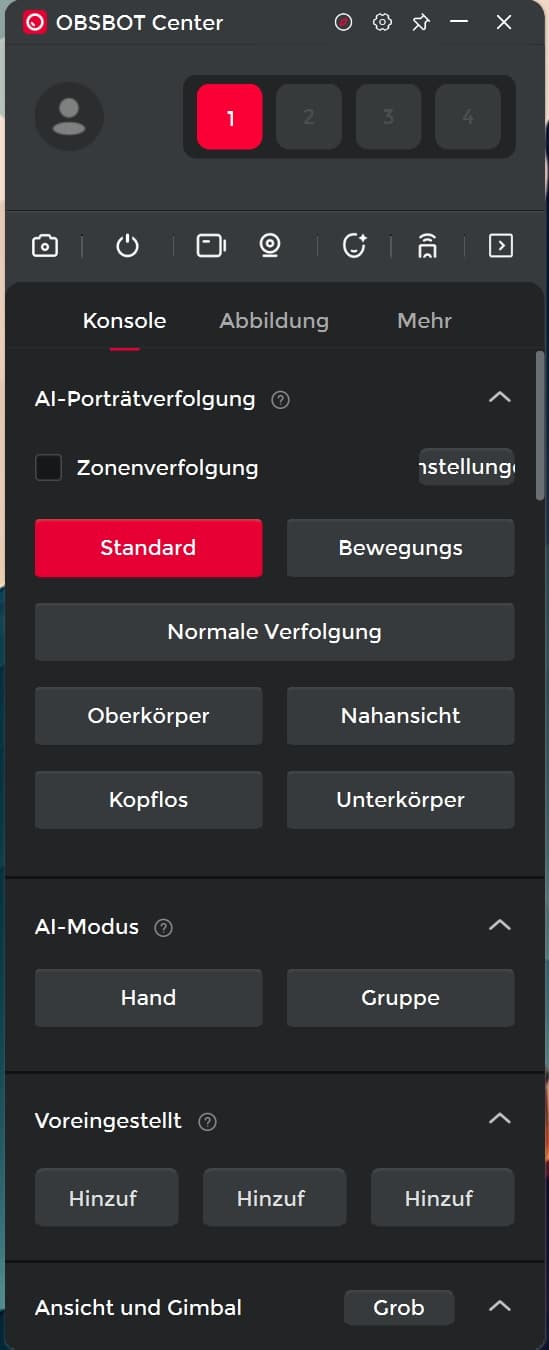 Die aufgeräumte Software bietet euch in drei Hauptreitern allerlei Einstellungmöglichkeiten. Im Bereich „Allgemein“ könnt ihr die KI-Features wie Tracking von Personen, der Hand oder einer ganzen Gruppe an Menschen einstellen. Beim Tracking von Personen bietet sich zudem die Möglichkeit, den Trackingpunkt beispielsweise auf Oberkörper oder Kopf einzustellen. Zudem könnt ihr mit einem virtuellen Joystick den Gimbal drehen und um das bis zu 4-fache in das Bild hineinzoomen.