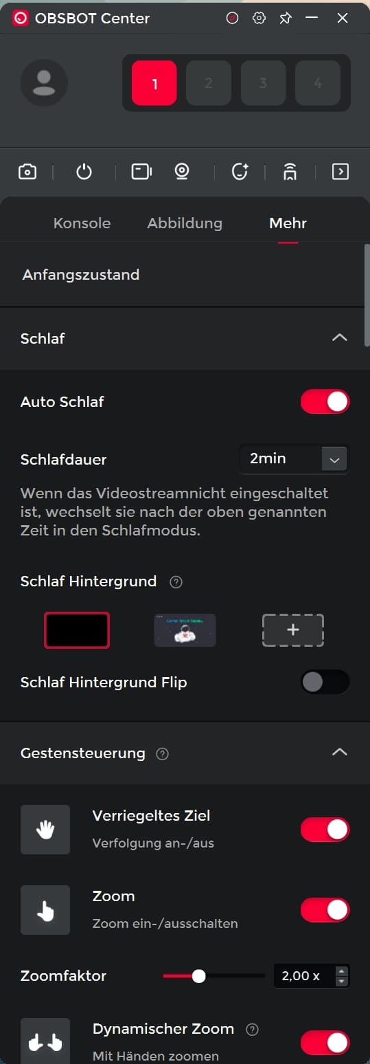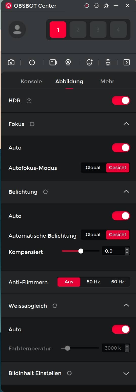 Bildeinstellungen vornehmen könnt ihr hingegen im Bereich „Abbildung“. Hier aktiviert oder deaktiviert ihr HDR, passt Fokus und Weißabgleich an (auf Wunsch automatisch oder manuell) und habt die Möglichkeit, das Bild hinsichtlich Helligkeit, Schärfe und Kontrast zu justieren. Unter „Mehr“ könnt ihr die Autoschlaf-Funktion einstellen, sowie die Gestensteuerung und Mikrofone einstellen.