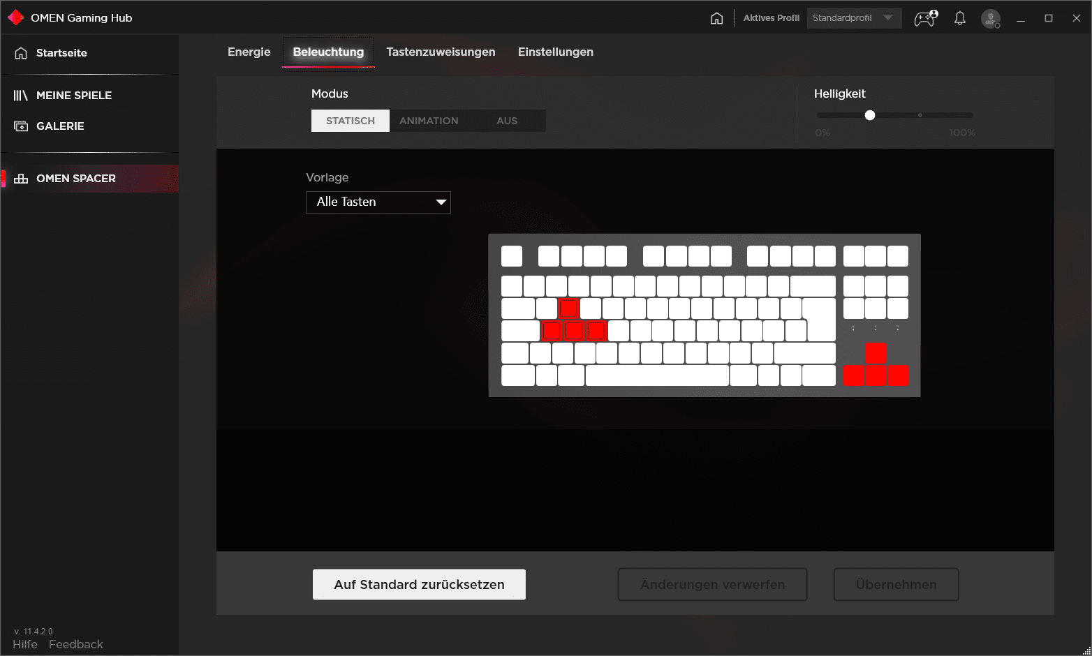 Die Beleuchtung können wir ebenso einstellen, auch wenn die Farbgebung sehr begrenzt ist. Wir können die Beleuchtung dimmen (0 %, 25 %, 50 %, 75 % und 100 % Prozent), und drei verschiedene Effekte wählen. Die Farben bleiben aber immer gleich – rot und weiß.