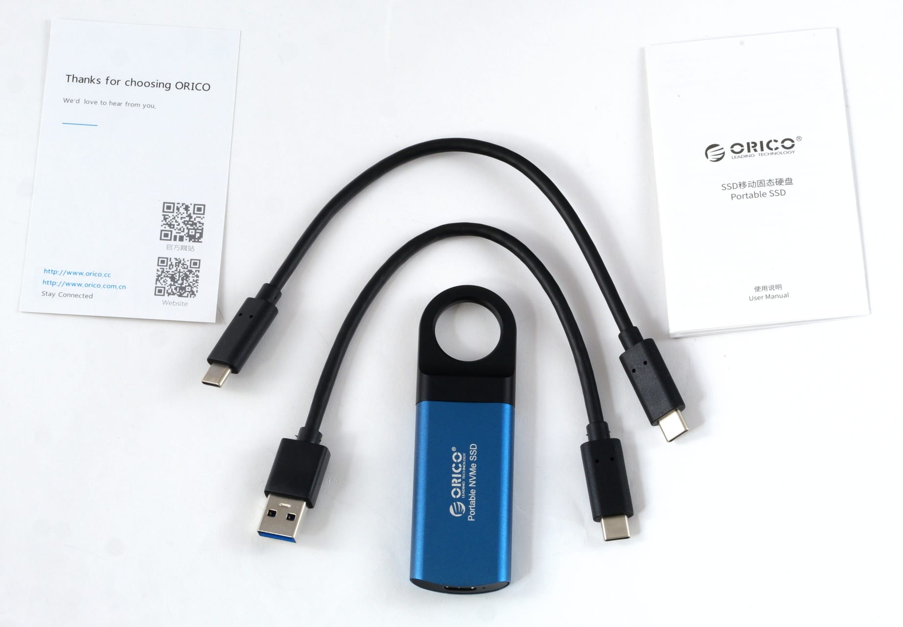 Die GV100 wird in einem kleinen Karton geliefert. Neben der SSD selbst sind eine knappe Anleitung sowie zwei gut 20 cm lange Anschlusskabel enthalten. Mit diesen lässt sich die SSD wahlweise an einem USB-A- oder USB-C-Anschluss verwenden.