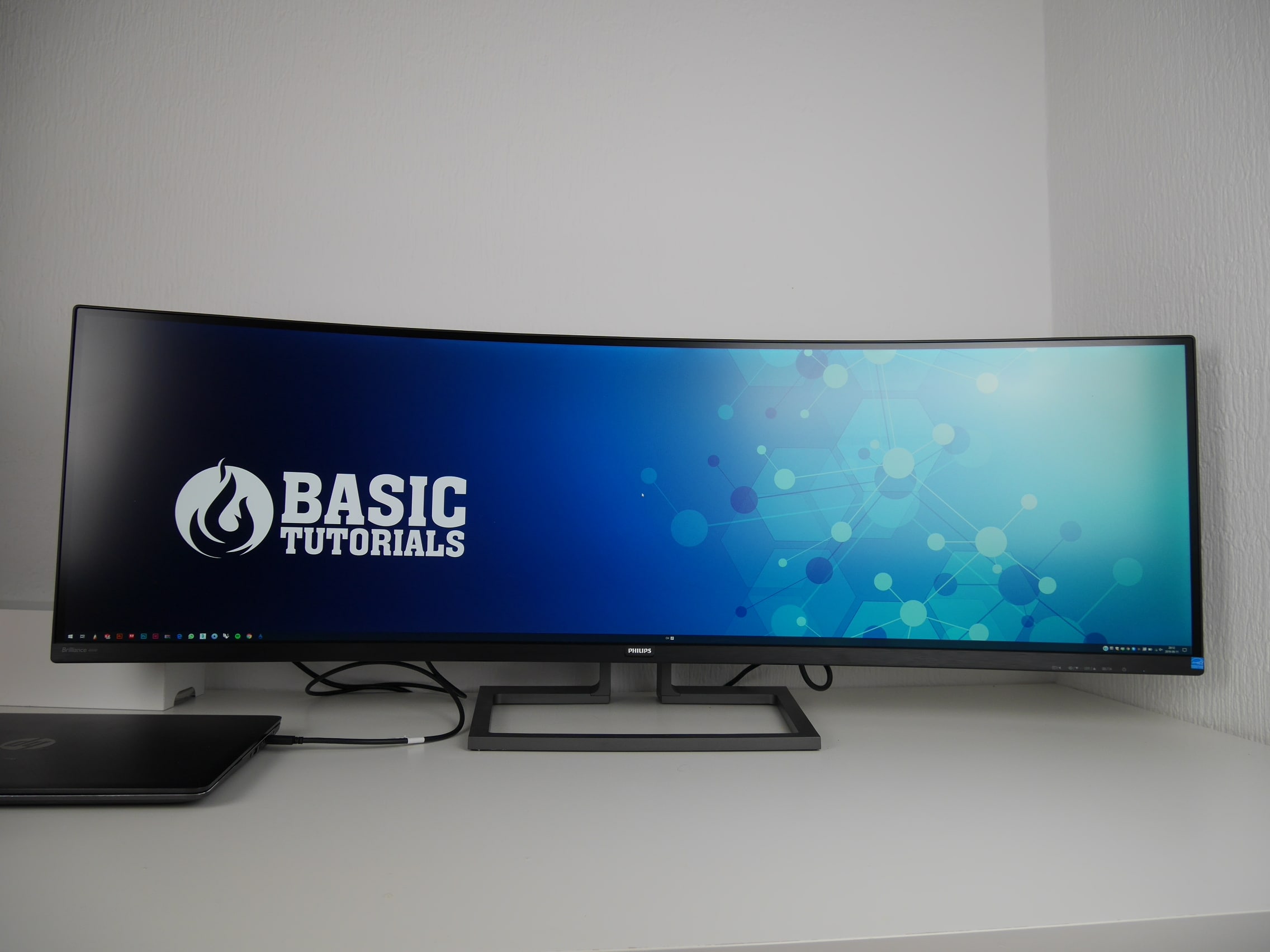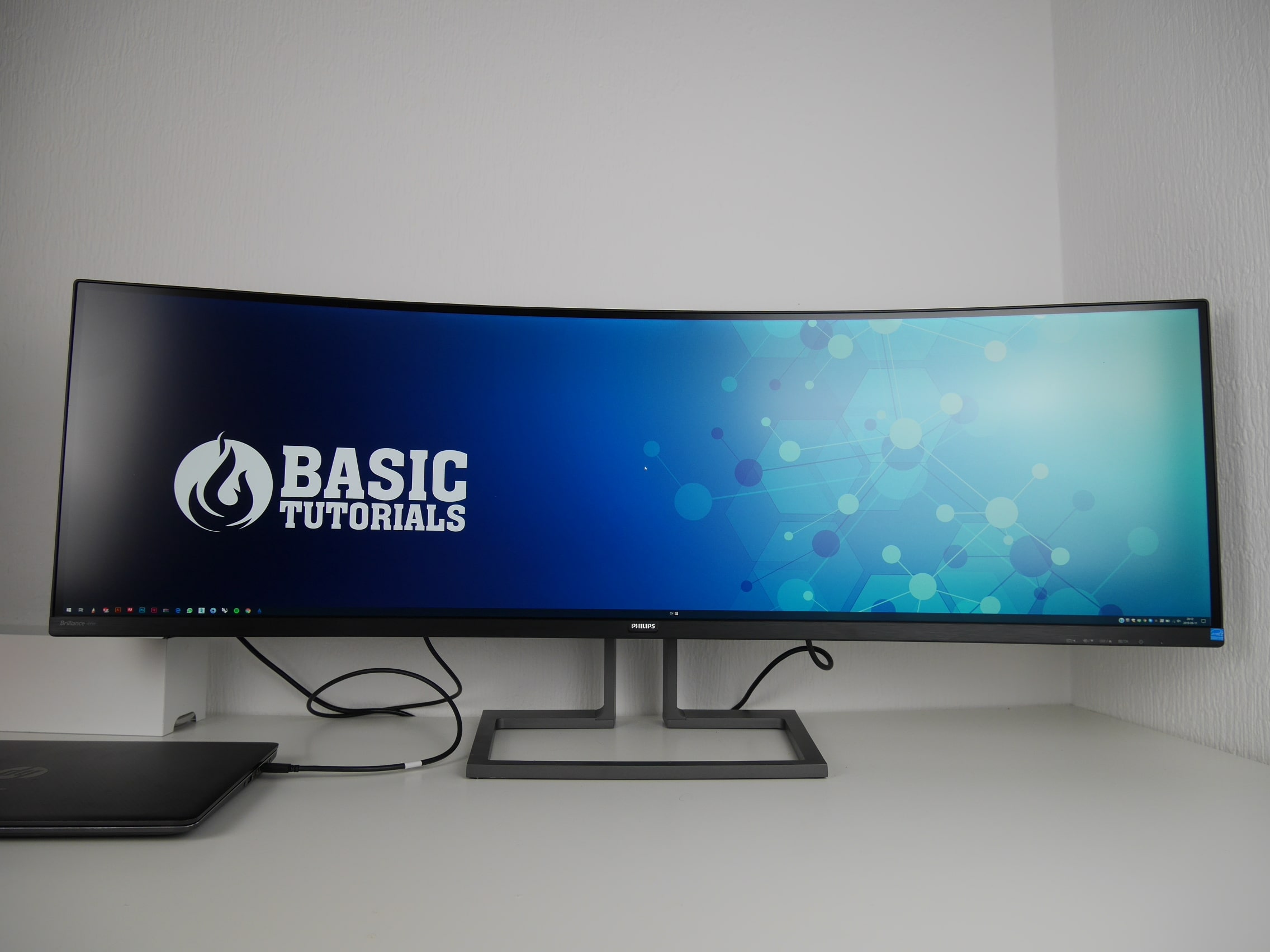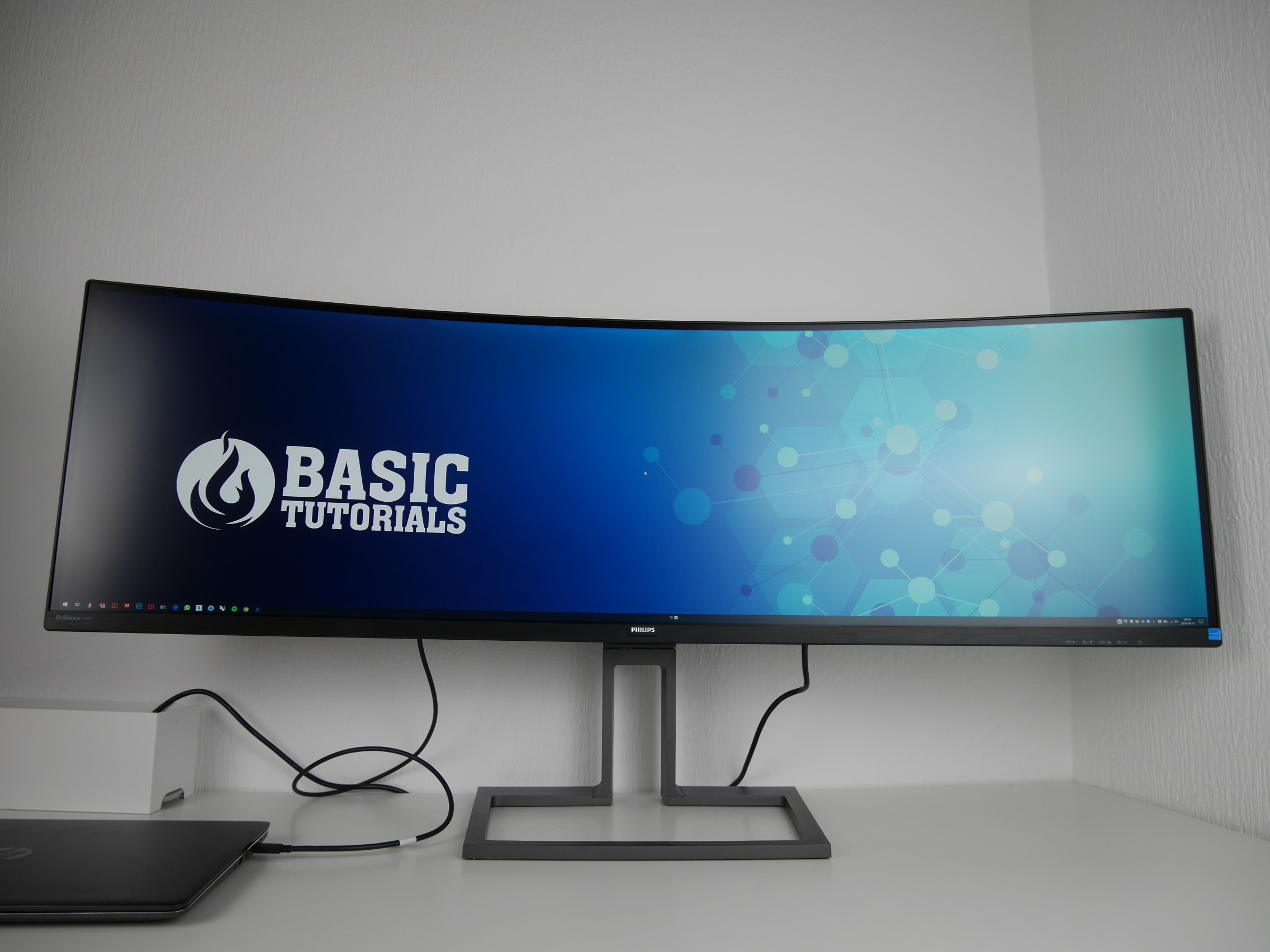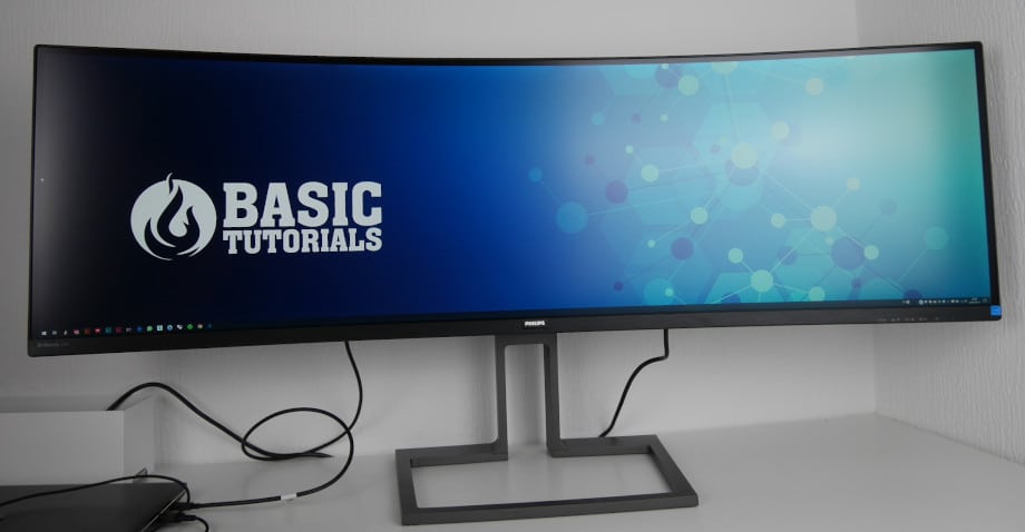 Der Philips 499P9H fällt auf den ersten Blick vor allem durch seine schiere Größe auf. Die Diagonale von 49 Zoll beziehungsweise 124 Zentimetern lässt rein optisch mein normales Setup aus zwei 27-Zoll-Monitoren klein erscheinen, obwohl die anzeigte Auflösung identisch ist. Normalgroße Schreibtische von 120 Zentimetern Länge füllt der Philips 499P9H damit fast komplett aus.