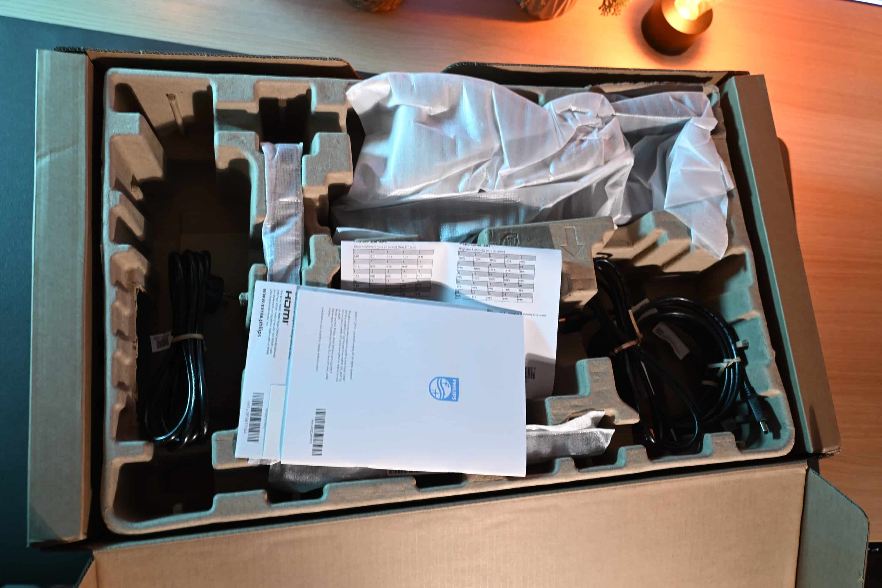 Der 25M2N5200U kommt sicher verpackt bei dir zu Hause an und ist, ohne Zuhilfenahme von Werkzeug, schnell und einfach montiert. Einfach Standfuß und Basis verschrauben, in die Rückseite einsetzen und schon bist du einsatzbereit. Alle notwendigen Kabel legt der Hersteller dem Lieferumfang bei. Löblich: Neben einem HDMI-Kabel gibt es auch eine DisplayPort-Strippe, das gibt es nicht oft.