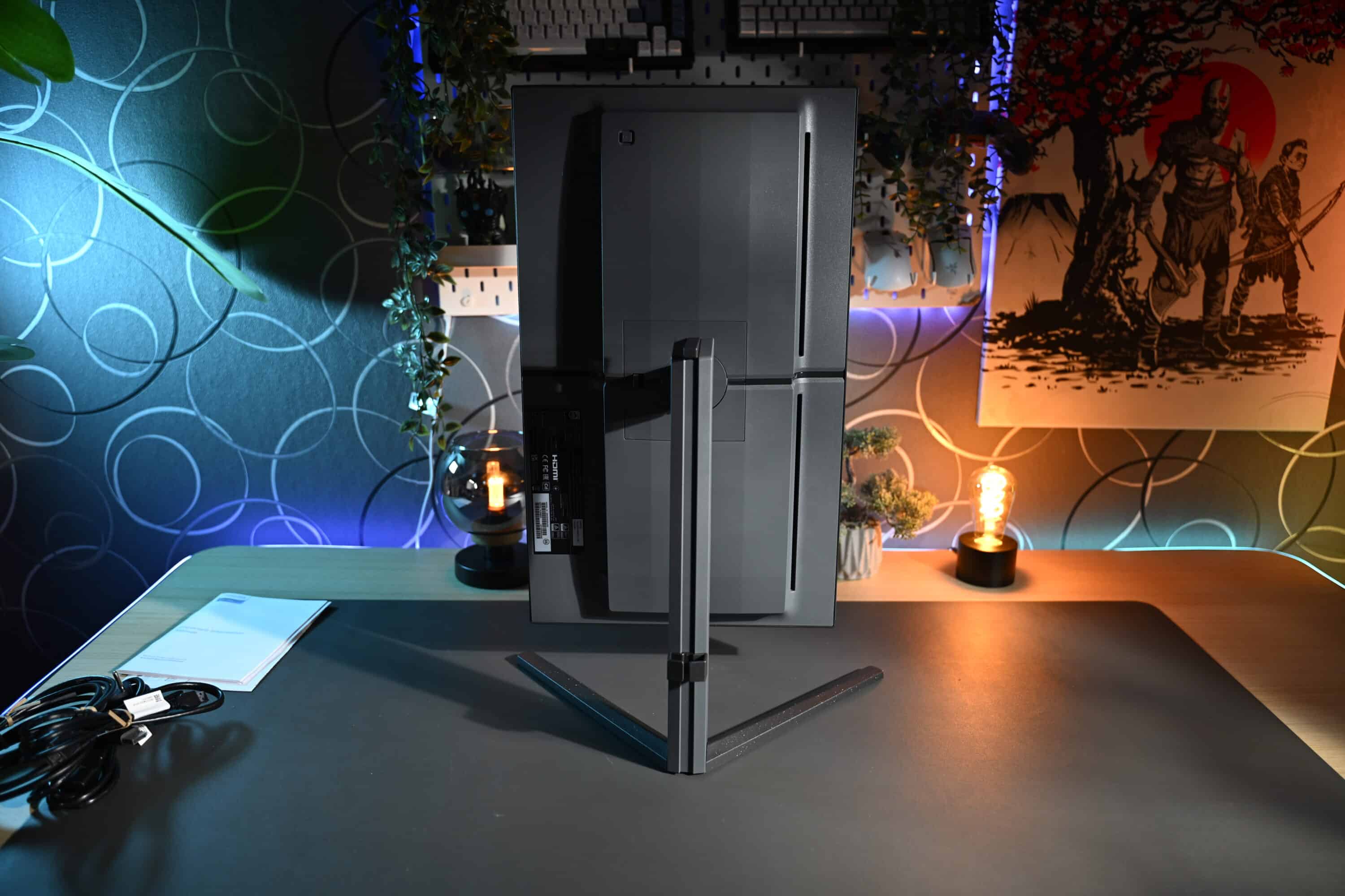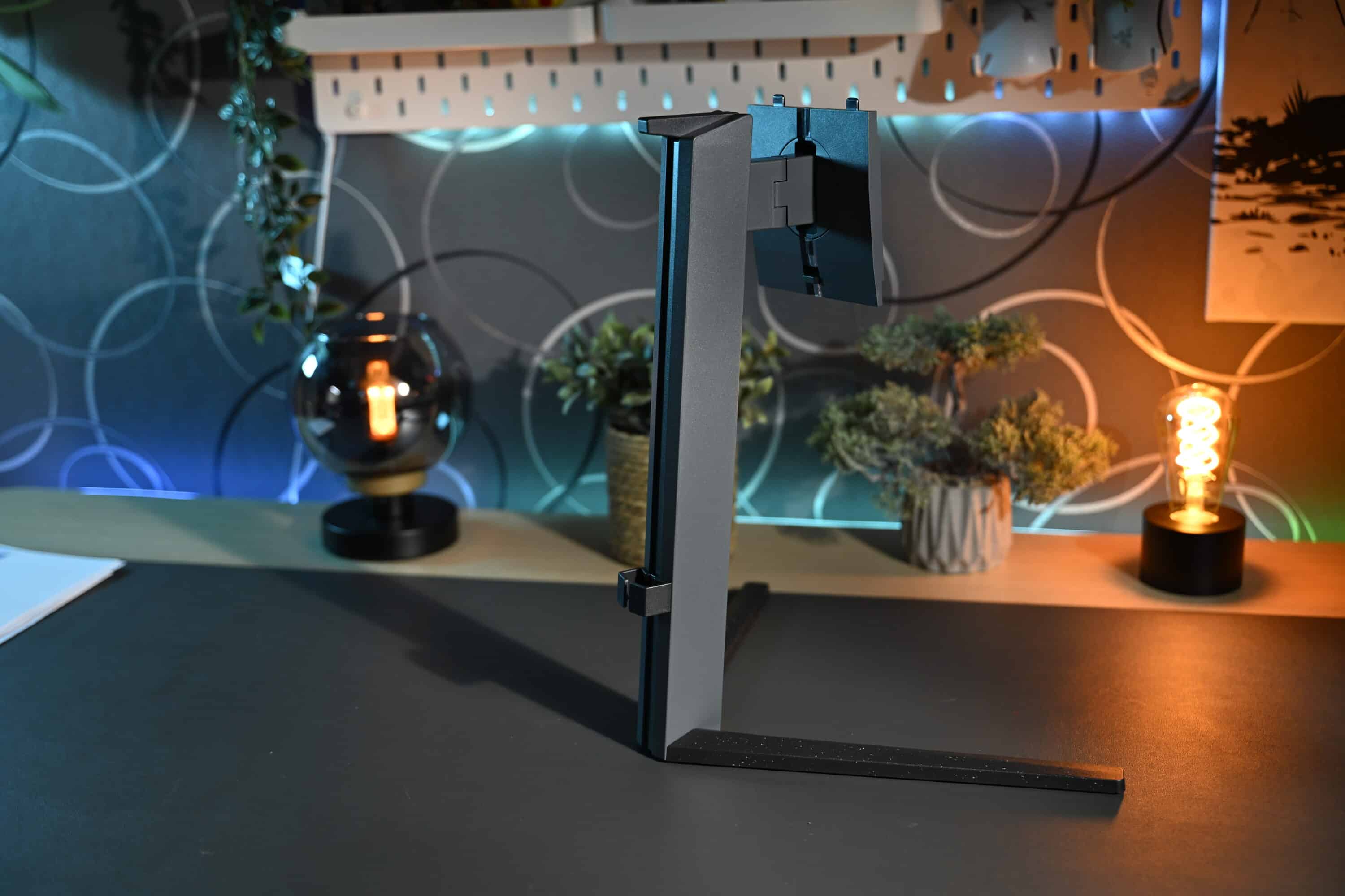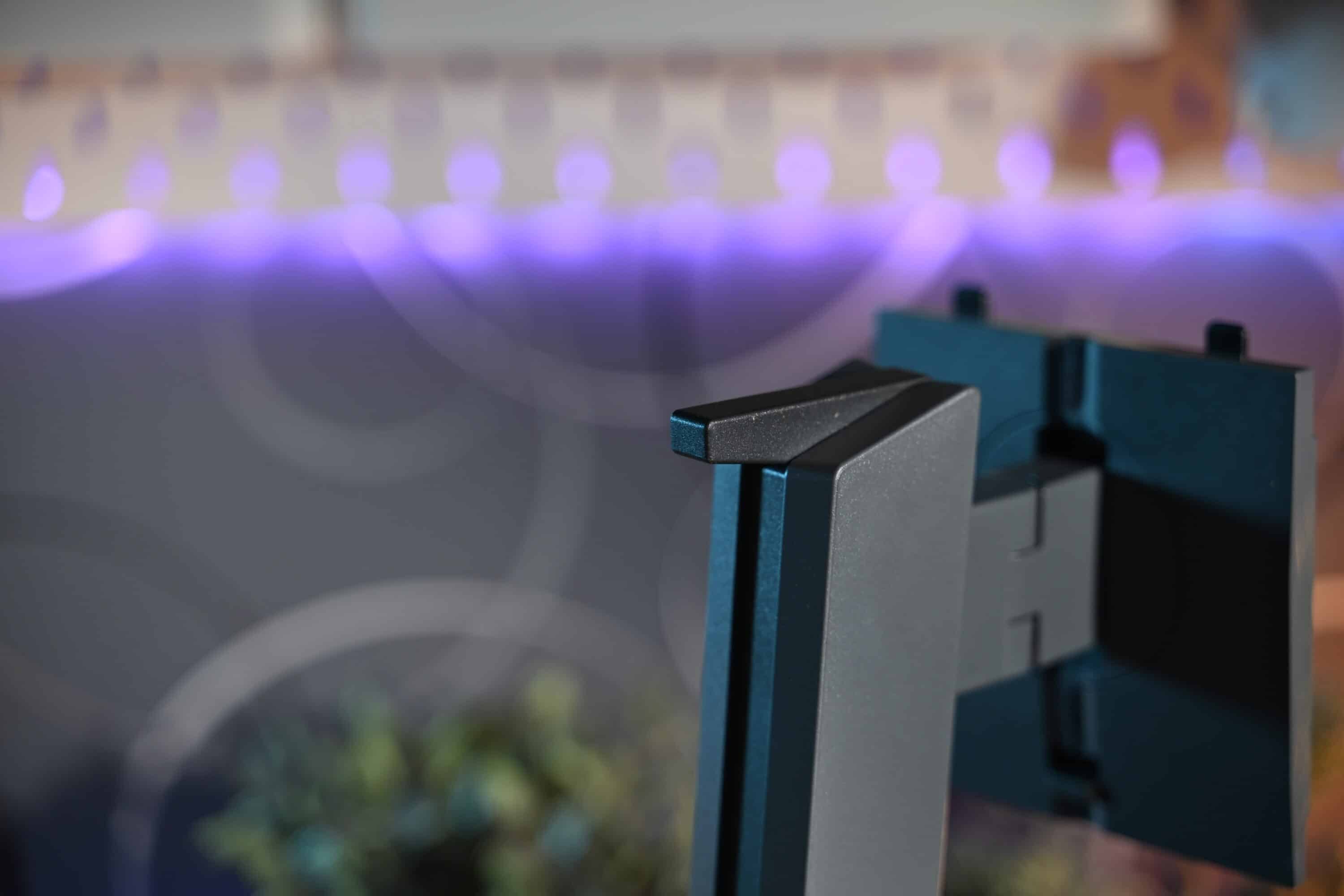 Der Monitor bringt, mit Standfuß, rund 5,09 kg auf die Waage, lässt sich aber auch ohne Standfuß problemlos per VESA-Bohrung an einen Monitorarm anbringen. Hier liegt das Gewicht bei angenehmen 3,39 kg ohne Standfuß. Der Standfuß bietet an der Rückseite eine dezente Headset-Halterung und ein simples Kabelmanagement-System.