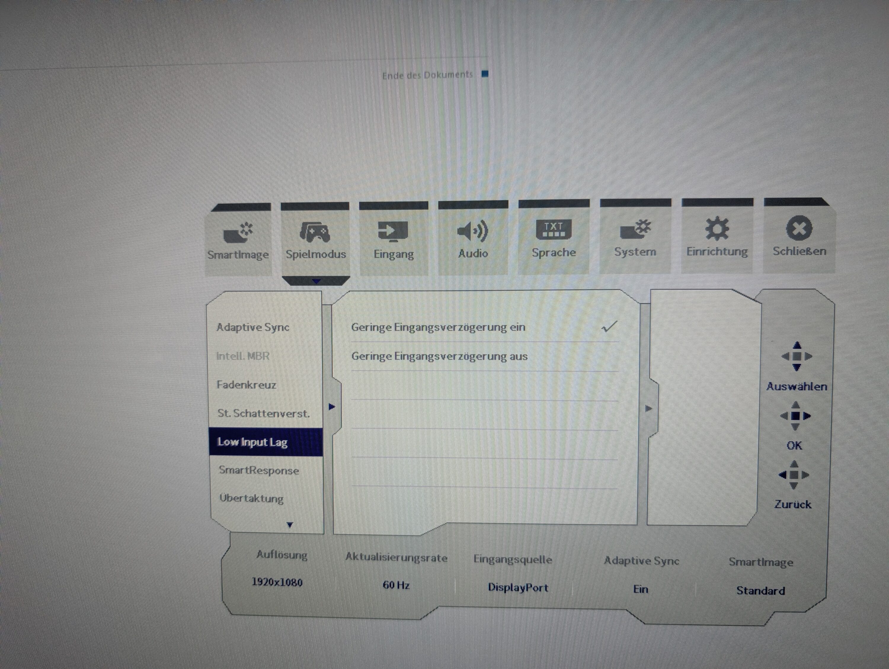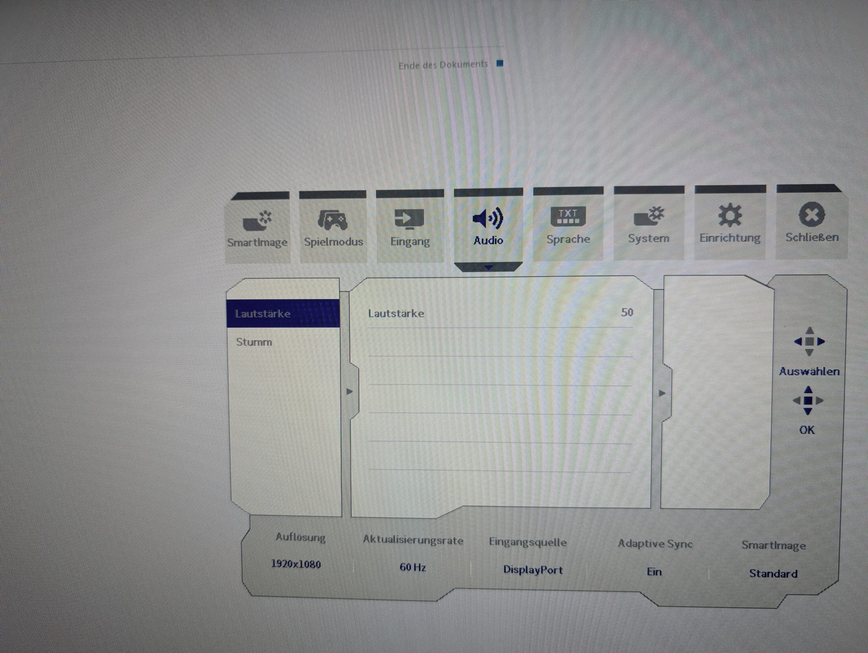 Drückst du darauf, öffnet sich das On-Screen-Display (OSD), in dem du diverse Einstellungen vornehmen kannst. Von Helligkeit über Kontrast bis hin zu Schärfe, Overdrive lässt sich hier absolut alles in einem klar struktruierten und übersichtlichen Interface einstellen.
