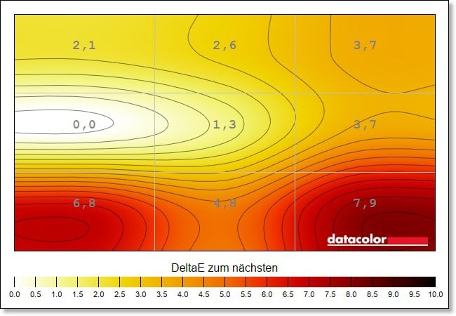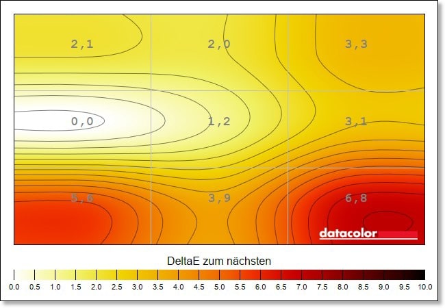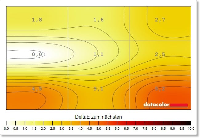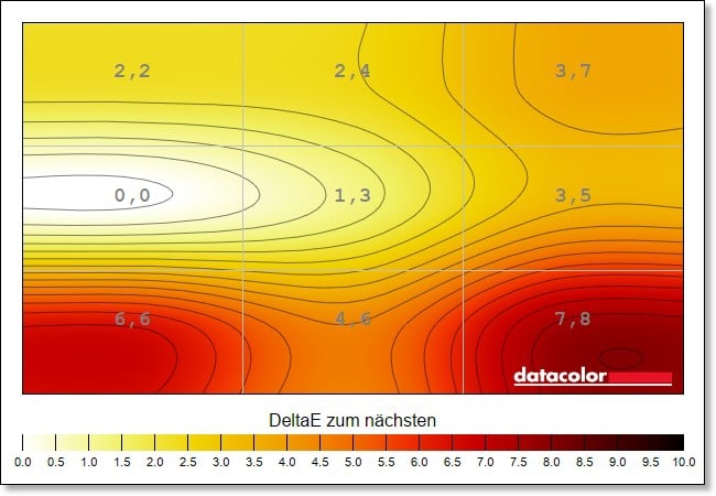 Die bereits angesprochenen Abweichungen in der Farbenauigkeit zeigen sich beim Test der Farb-Homogenität. Insbesondere im rechten und linken unteren Eck zeigen sich Unterschiede von bis zu Delta E 7,9 bei maximaler Helligkeit, was ausgesprochen hohe Abweichungen sind. Bei 50 Prozent Helligkeit fallen die Abweichungen deutlich geringer aus.