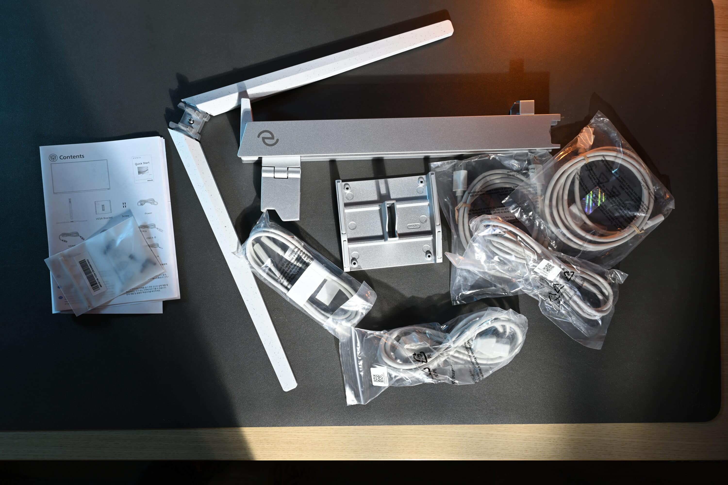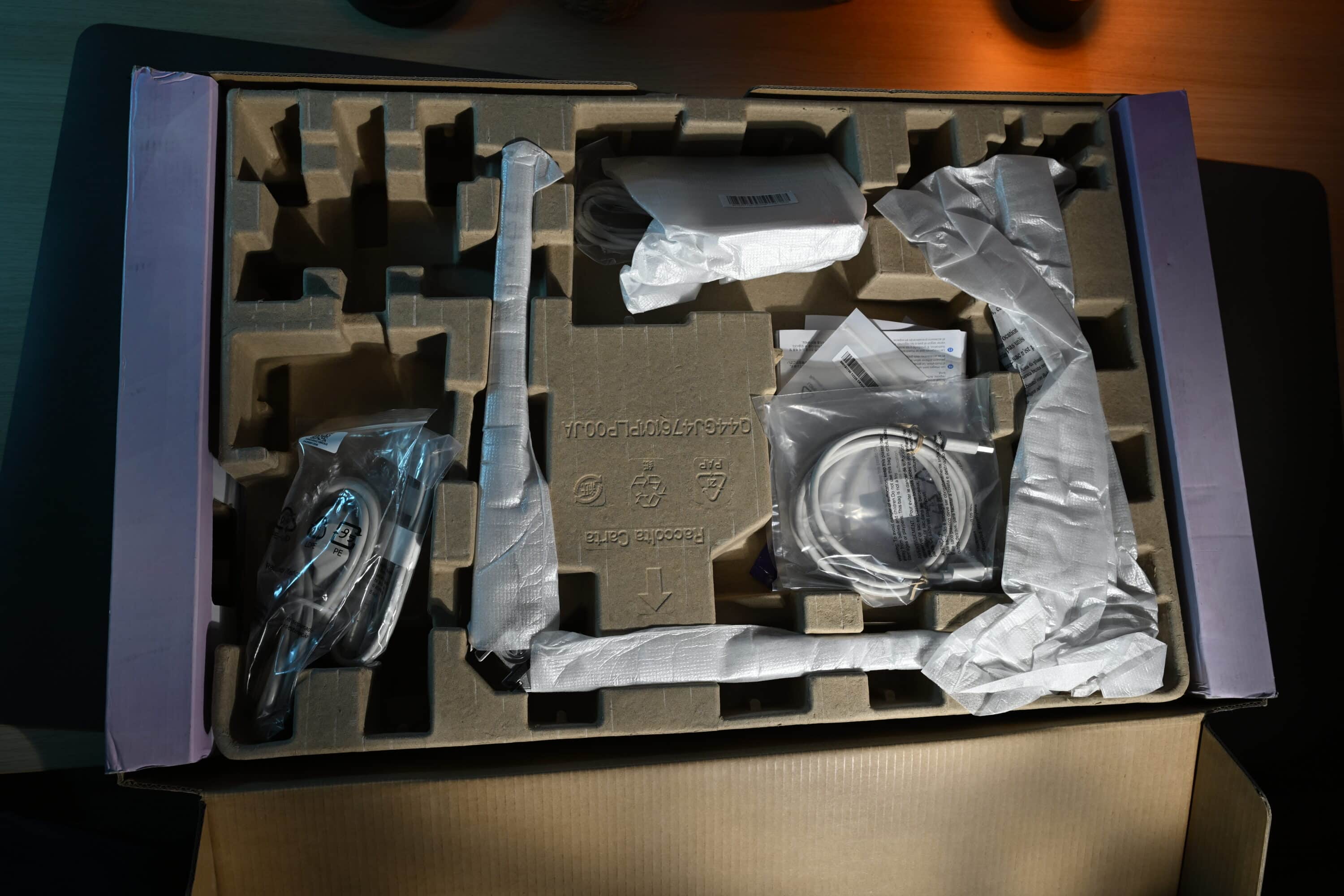 Wie bei dem Geschwistermodell, erfolgt auch der Aufbau des Philips Evnia 32M2N8900 werkzeuglos. Einfach Standfuß und Halterung verschrauben, in die Rückseite des Monitors einsetzen und schon kann es losgehen. Im aufgeräumten Lieferumfang findest du sämtliche Kabel, die in irgendeiner Form nötig sein könnten. Sogar an ein DisplayPort-Kabel hat der Hersteller gedacht.
