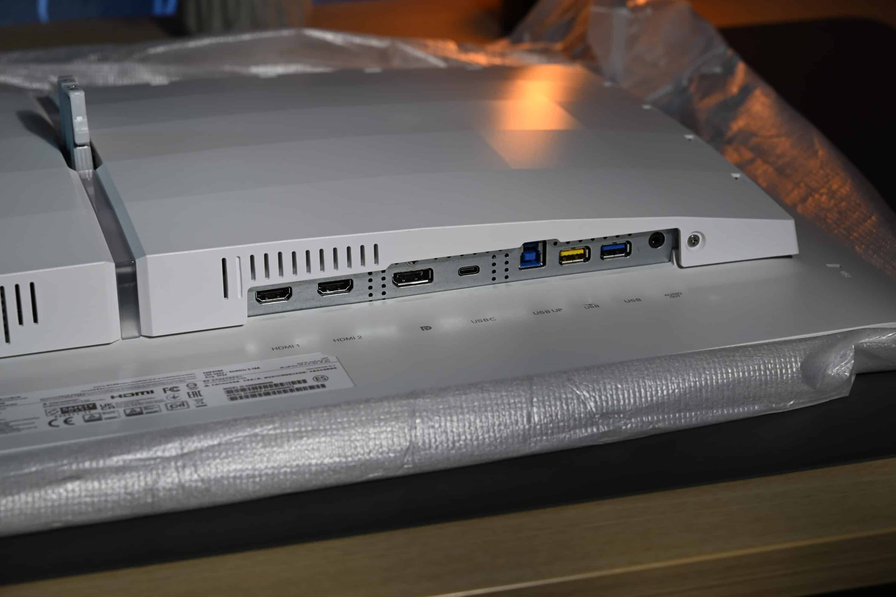 Der Monitor setzt auf eine Bilddiagonale von 31,5 Zoll und bringt, mit Standfuß, 9,65 kg auf die Waage. Natürlich ist auch eine Wandmontage möglich, diese erfolgt über eine VESA 100×100-Bohrung, dafür wird aber die im Lieferumfang enthaltene Montageplatte benötigt. Ohne Standfuß kommt das Display dann noch auf 8,18 kg, womit die meisten Monitorarme kein Problem haben sollten.