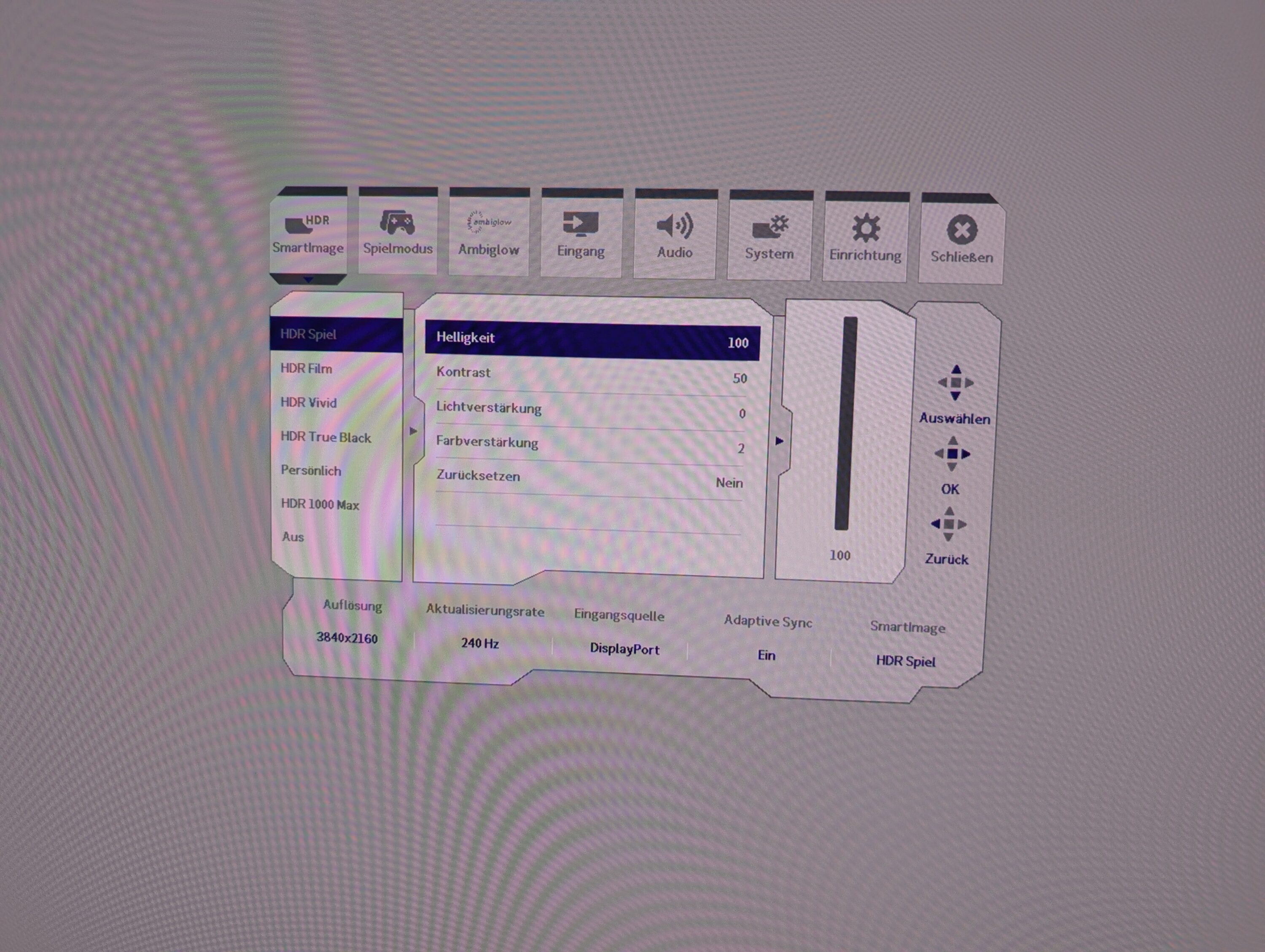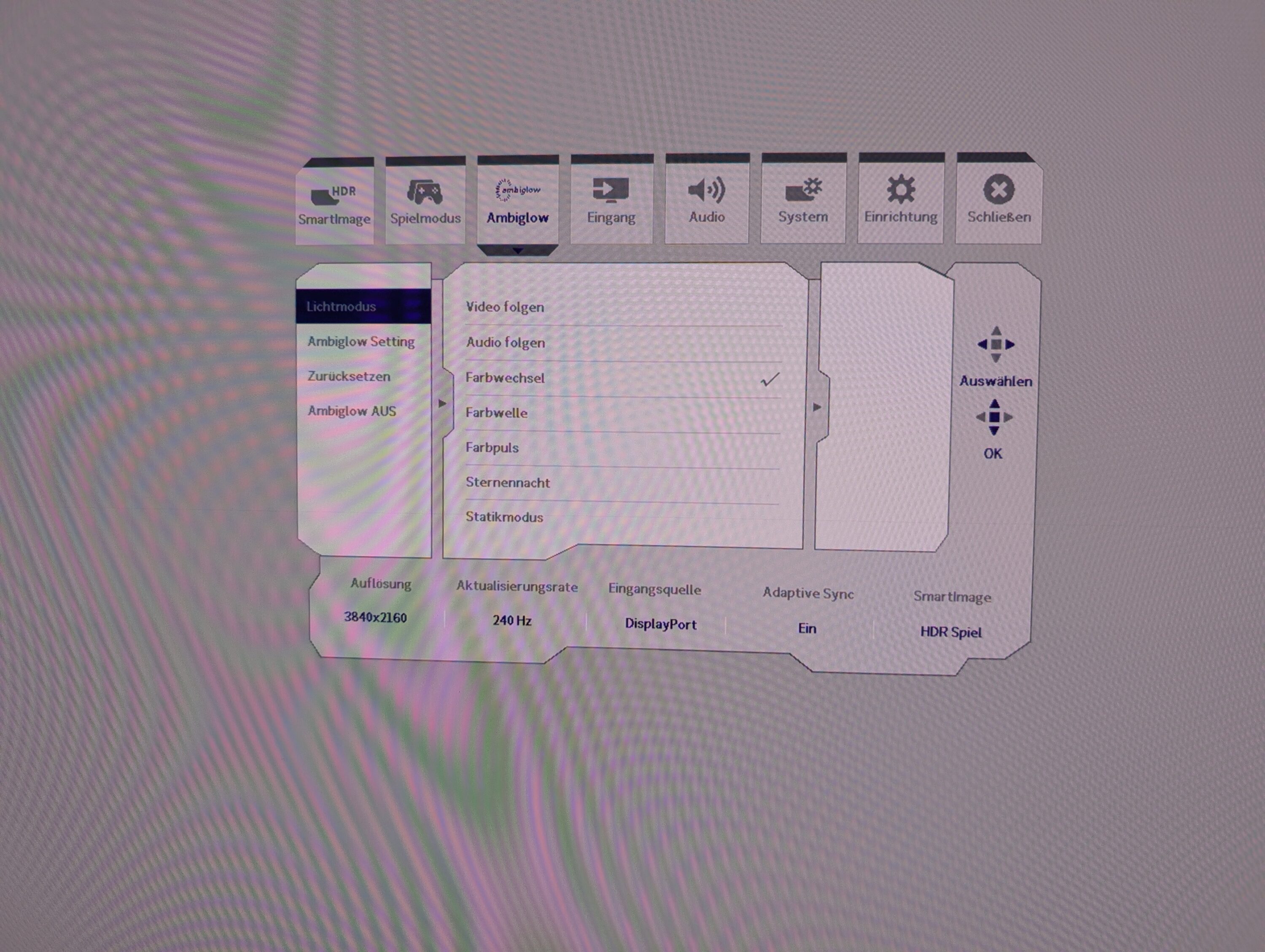 Von der Helligkeit über den Kontrast bis hin zu den Ambiglow-Einstellungen und der OLED-Pflege kannst du hier alles perfekt einstellen. An der unteren Leiste informiert das On-Screen-Display zudem über die aktuelle Auflösung, Bildrate, Eingangsquelle und den Bildmodus.