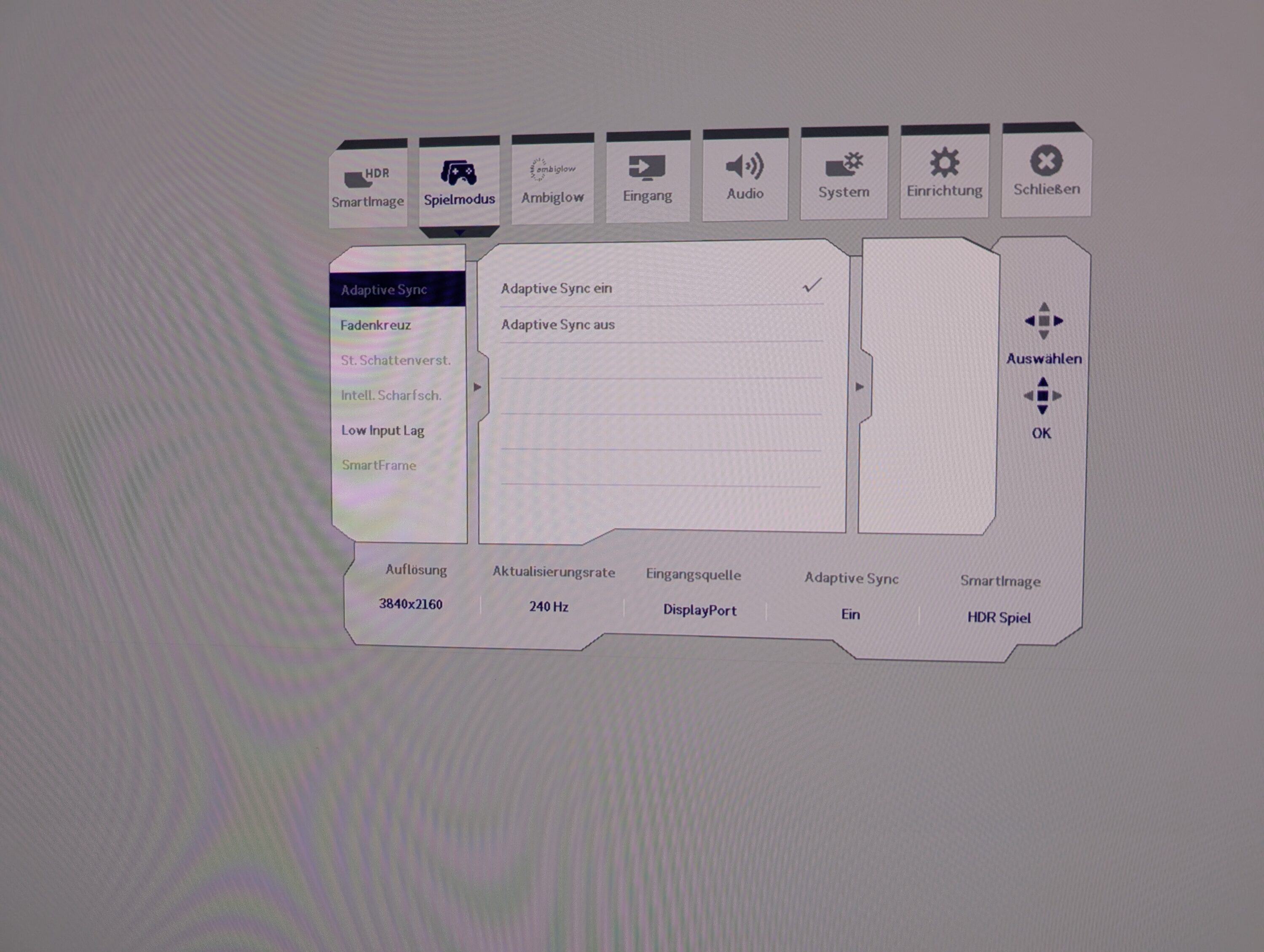 Dieses führt dich zudem durch das On-Screen-Display, das mit einem aufgeräumten und übersichtlichen Design aufwartet. Hier findet sich jeder problemlos zurecht. Auf insgesamt acht Seiten kannst du verschiedene Einstellungen vornehmen.