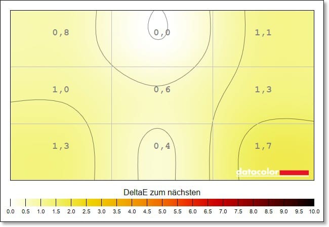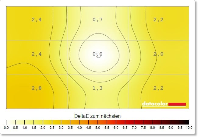 Auch die Farb-Homogenität, die die Ausgeglichenheit der Farbdarstellung aufzeigt, liegt auf exzellentem Niveau und leistet sich bei keiner Einstellung Patzer oder starke Abweichungen. Diese liegen maximal bei Dewlta E 2,8 bei 100 Prozent Helligkeit und nehmen ab, je dunkler du das Display einstellst.