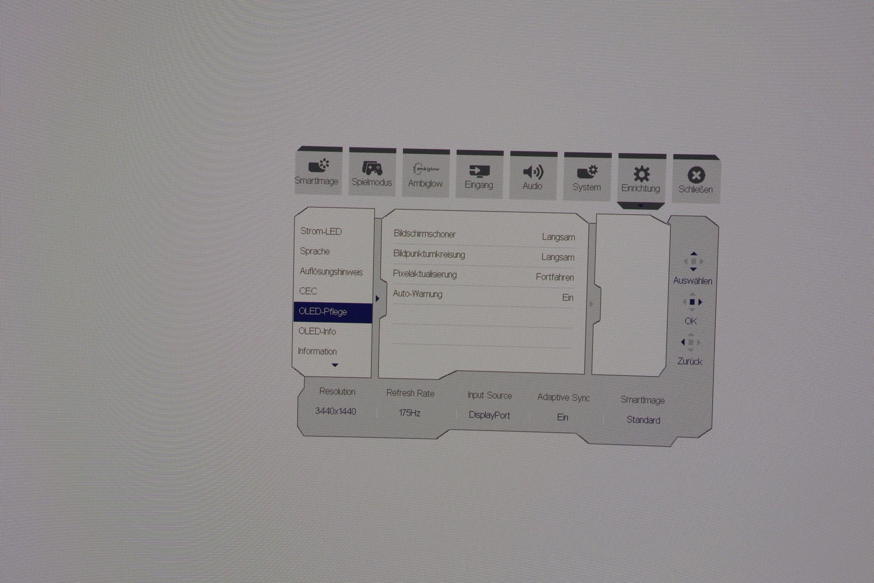 Wer sich hier etwas Zeit nimmt, kann den Monitor perfekt an die eigenen Vorlieben anpassen und so die Bildqualität noch weiter verbessern. Besonders wichtig bei einem OLED-Display sind natürlich die Schutzmechanismen, um Einbrennen zu verhindern. Hier bietet der PHILIPS Evnia 34M2C6500 verschiedene Optionen wie Bildschirmschoner, Pixelversatz, Pixel-Aktualisierung oder Auto-Wartung.