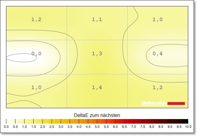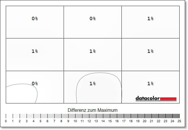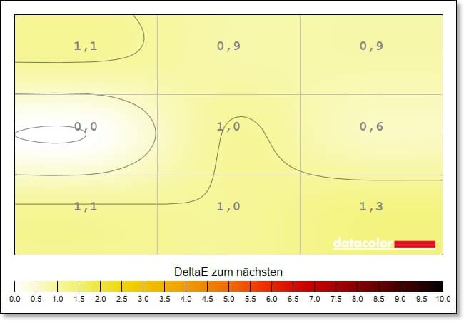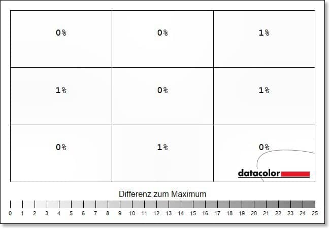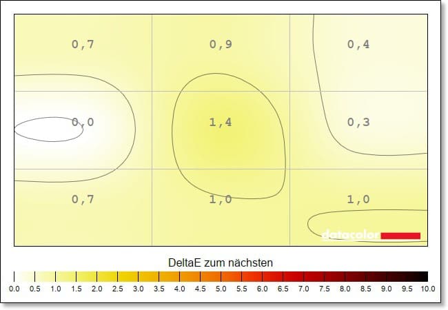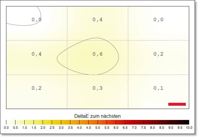 Sehr gut verhält es sich zudem mit der Homogenität des Displays. Sowohl was die Farbdarstellung als auch was die Helligkeit anbelangt. Bei der Farb-Homogenität zeigen sich maximal Abweichungen von DeltaE 1,4 – was einen sehr niedrigen Wert darstellt. Andere OLED-Displays bieten hier mit Werten von mehr als 2,5 deutlich höhere Abweichungen, günstigere VA- und IPS-Panels kommen hier gar auf Werte von 5,0 und mehr.