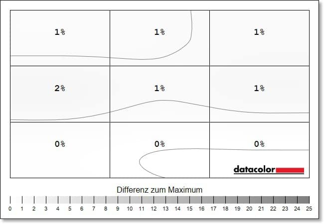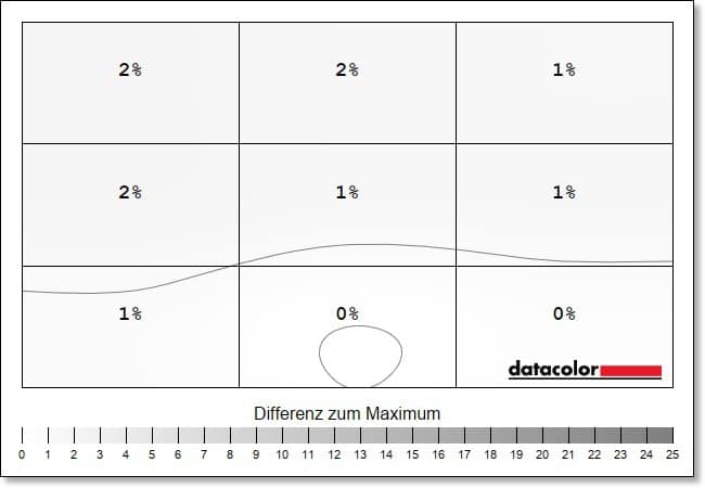 Die Homogenität der Ausleuchtung hingegen ist beim PHILIPS Evnia 34M2C6500 nahezu perfekt. Hier messen wir maximal Abweichungen von 2 Prozent gegenüber dem Idealwert. Selbst unter OLED-Displays sind Werte von 5-10 Prozent keine Seltenheit.